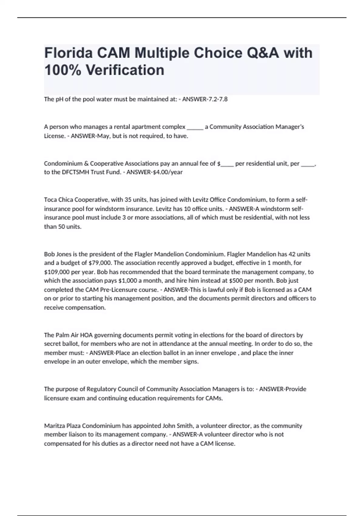 The pH of the pool water must be maintained at: - ANSWER-7.2-7.8 A person who manages a rental apartment complex _____ a Community Association Manager's License. - ANSWER-May, but is not required, to have. Condominium & Cooperative Associations pay an annual fee of $____ per residential unit, per ____, to the DFCTSMH Trust Fund. - ANSWER-$4.00/year Toca Chica Cooperative, with 35 units, has joined with Levitz Office Condominium, to form a self-insurance pool for windstorm insurance. Levitz has 10 office units. - ANSWER-A windstorm self-insurance pool must include 3 or more associations, all of which must be residential, with not less than 50 units. Bob Jones is the president of the Flagler Mandelion Condominium. Flagler Mandelion has 42 units and a budget of $79,000. The association recently approved a budget, effective in 1 month, for $109,000 per year. Bob has recommended that the board terminate the management company, to which the association pays $1,000 a month, and hire him instead at $500 per month. Bob just completed the CAM Pre-Licensure course. - ANSWER-This is lawful only if Bob is licensed as a CAM on or prior to starting his management position, and the documents permit directors and officers to receive compensation. The Palm Air HOA governing documents permit voting in elections for the board of directors by secret ballot, for members who are not in attendance at the annual meeting. In order to do so, the member must: - ANSWER-Place an election ballot in an inner envelope , and place the inner envelope in an outer envelope, which the member signs. The purpose of Regulatory Council of Community Association Managers is to: - ANSWER-Provide licensure exam and continuing education requirements for CAMs. Maritza Plaza Condominium has appointed John Smith, a volunteer director, as the community member liaison to its management company. - ANSWER-A volunteer director who is not compensated for his duties as a director need not have a CAM license. Prospective members must receive certain information from an HOA when purchasing a new unit, including: - ANSWER-Community association disclosures.