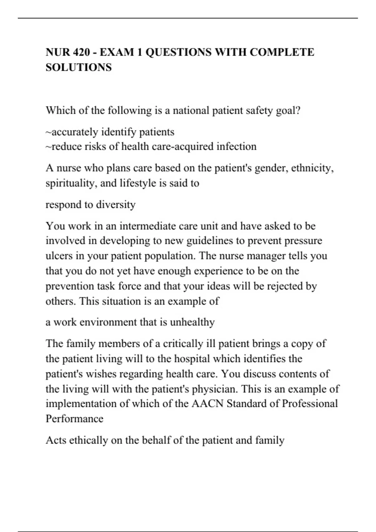 NUR 420 - EXAM 1 QUESTIONS WITH COMPLETE SOLUTIONS