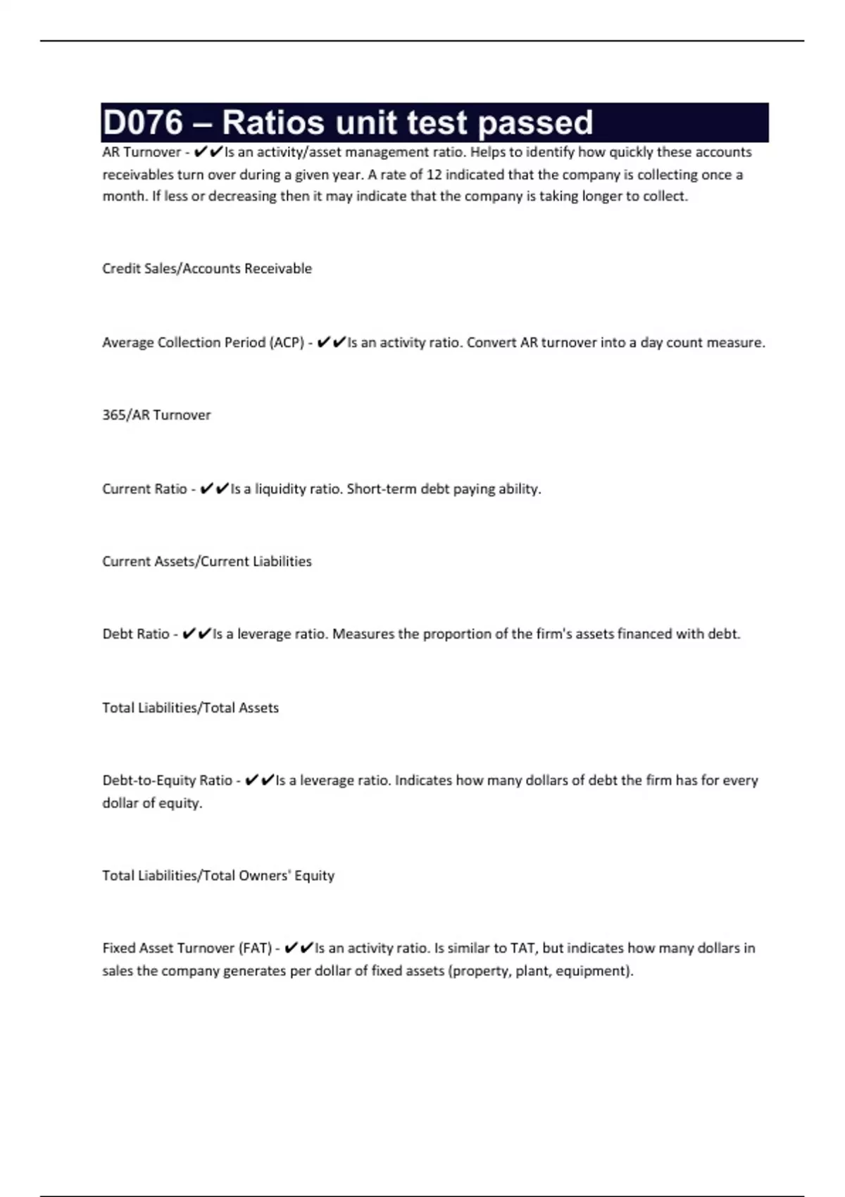 AR Turnover - Is an activity/asset management ratio. Helps to identify how quickly these accounts receivables turn over during a given year. A rate of 12 indicated that the company is collecting once a month. If less or decreasing then it may indicate that the company is taking longer to collect. Credit Sales/Accounts Receivable Average Collection Period (ACP) - Is an activity ratio. Convert AR turnover into a day count measure. 365/AR Turnover Current Ratio - Is a liquidity ratio. Short-term debt paying ability. Current Assets/Current Liabilities Debt Ratio - Is a leverage ratio. Measures the proportion of the firm's assets financed with debt. Total Liabilities/Total Assets Debt-to-Equity Ratio - Is a leverage ratio. Indicates how many dollars of debt the firm has for every dollar of equity. Total Liabilities/Total Owners' Equity Fixed Asset Turnover (FAT) - Is an activity ratio. Is similar to TAT, but indicates how many dollars in sales the company generates per dollar of fixed assets (property, plant, equipment).