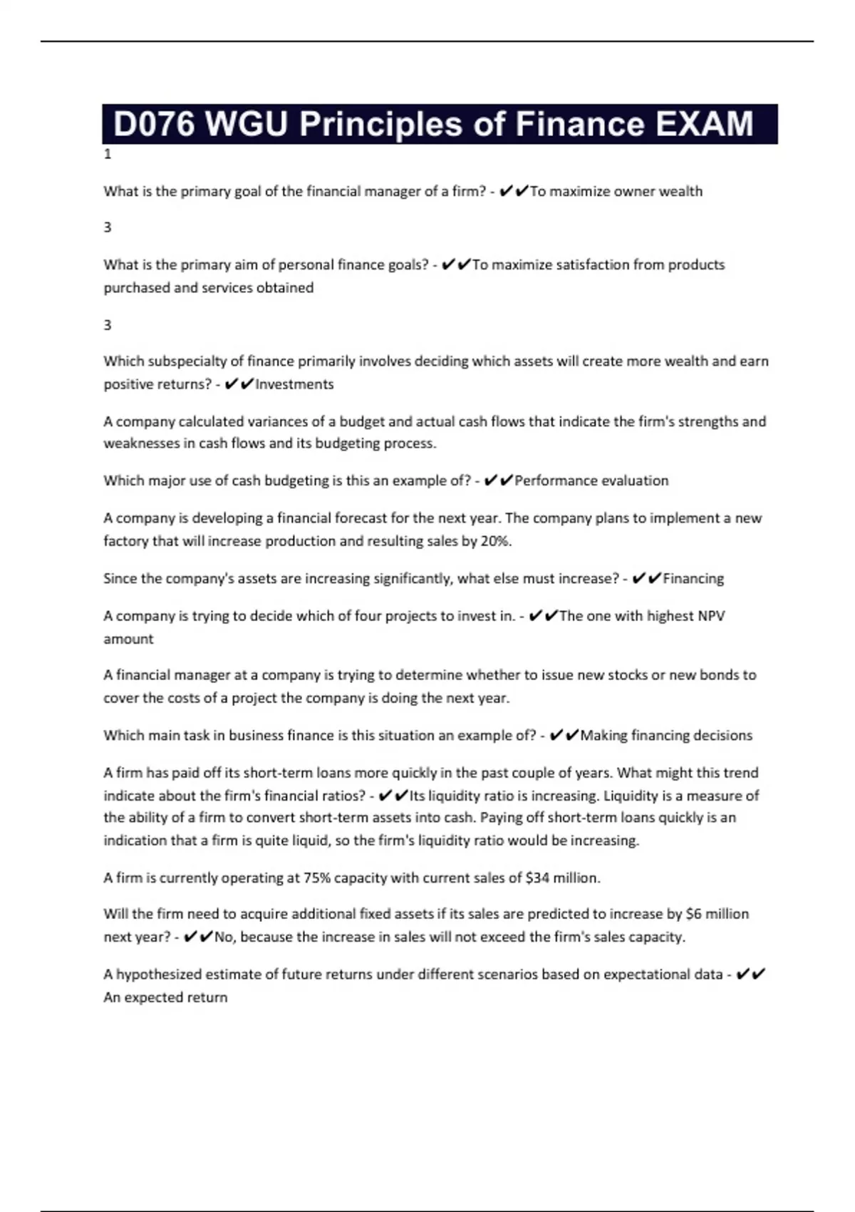 1 What is the primary goal of the financial manager of a firm? - To maximize owner wealth 3 What is the primary aim of personal finance goals? - To maximize satisfaction from products purchased and services obtained 3 Which subspecialty of finance primarily involves deciding which assets will create more wealth and earn positive returns? - Investments A company calculated variances of a budget and actual cash flows that indicate the firm's strengths and weaknesses in cash flows and its budgeting process. Which major use of cash budgeting is this an example of? - Performance evaluation A company is developing a financial forecast for the next year. The company plans to implement a new factory that will increase production and resulting sales by 20%. Since the company's assets are increasing significantly, what else must increase? - Financing A company is trying to decide which of four projects to invest in. - The one with highest NPV amount A financial manager at a company is trying to determine whether to issue new stocks or new bonds to cover the costs of a project the company is doing the next year. Which main task in business finance is this situation an example of? - Making financing decisions A firm has paid off its short-term loans more quickly in the past couple of years. What might this trend indicate about the firm's financial ratios? - Its liquidity ratio is increasing. Liquidity is a measure of the ability of a firm to convert short-term assets into cash. Paying off short-term loans quickly is an indication that a firm is quite liquid, so the firm's liquidity ratio would be increasing. A firm is currently operating at 75% capacity with current sales of $34 million. Will the firm need to acquire additional fixed assets if its sales are predicted to increase by $6 million next year? - No, because the increase in sales will not exceed the firm's sales capacity. A hypothesized estimate of future returns under different scenarios based on expectational data - An expected return A large corporation is looking to merge with another large corporation. Which financial institution can help them do this? - Investment bank A local start-up company just hit its five-year anniversary and is planning an initial public offering sometime this year. In order to issue public stock, which market will the company use? - When a company issues stock for the first time to raise capital, shares must initially be sold through a primary market. A pharmaceutical company recently spent $2 million developing a new drug. The company then conducts capital budgeting analysis to determine if it should produce the newly developed drug. The net present value (NPV) of the project is $1.5 million. Why should this company produce the drug? - Because the NPV is greater than zero A sign company is planning to have an initial public offering (IPO). In which type of market will its stock first be sold to the public? - Primary market About a year ago, the short-term Treasury bill had 1.54% interest and the long-term Treasury note had 2.54% interest. This week, the 1-year Treasury bill has an interest rate of 3.13%, while the 10-year Treasury note has an interest rate of 2.28%. What does this information indicate about the future economy? - It may indicate an economic downturn. Since the long-term Treasury interest rate is lower than the short-term rate, it has an inverted yield curve, which may indicate an economic downturn. Activity ratios - measure how well the company uses its assets to generate sales or cash—the firm's operational efficiency and profitability. An employee was recently hired as a financial analyst and asked to create a cash budget for the employee's division for the next year. Which component should the employee exclude from the budget? - Purchase of equipment that will be bought in three years An energy company discovers that a new bill has been proposed to change the amount of fuel that can be exported outside the country. If passed, this could have a serious negative effect on the company's revenues. Some of the company's competitors are obtaining insurance policies to compensate for this risk, but since the energy company believes the likelihood of this bill passing is low, it chooses to do nothing—ultimately taking responsibility for this particular risk instead of trying to transfer the risk through an insurance policy. Which risk management technique is this choice an example of? - Risk Retention An investment analyst is concerned about a construction company's ability to sell its inventory to meet current obligations, because much of the inventory (commercial buildings) it builds and sells takes longer than a year to construct. Which ratio should this analyst use to consider the effect of the firm's inventory on the firm's ability to meet current obligations? - Quick ratio An investor is reviewing the bonds of four different companies: Company A issues AA-rated bonds. Company B issues A-rated bonds. Company C issues BB-rated bonds. Company D issues C-rated bonds. Which company is likely to provide the lowest rate of return to the investor? - Company A An investor just purchased a bond for $973 that has a par value of $1,000. What type of bond is this? - A discount bond. When the market price is less than the par price of a bond, you know that the YTM is currently higher than the coupon rate of that particular bond, so it is being sold at a discount. An investor really cares about having voting rights in a firm. Which type of financial security should this investor purchase? - Common stock As an active investor, Maria is analyzing her portfolio to decide if there are any stocks she should remove from her pool of financial securities. A company she has invested in, Quiet Flag Industries, just released its annual report. Which kind of method should Maria use to see if the company has improved? - Trend analysis Capital Market - More often used for long-term assets that are held for greater th