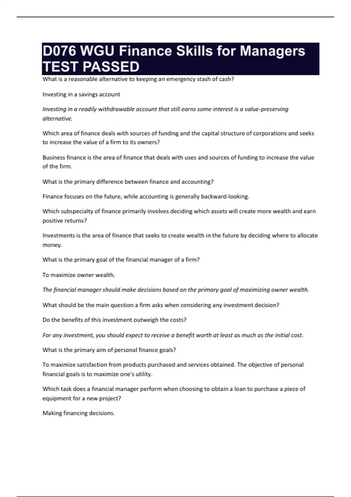 D076 WGU Finance Skills for Managers TEST PASSED