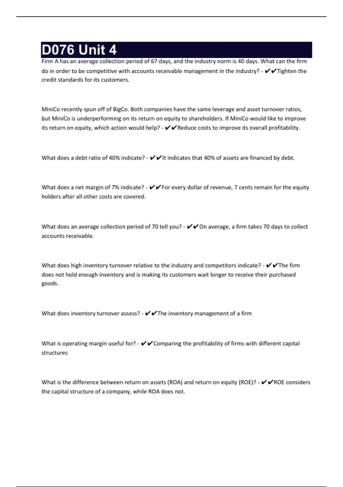 Firm A has an average collection period of 67 days, and the industry norm is 40 days. What can the firm do in order to be competitive with accounts receivable management in the industry? - Tighten the credit standards for its customers. MiniCo recently spun off of BigCo. Both companies have the same leverage and asset turnover ratios, but MiniCo is underperforming on its return on equity to shareholders. If MiniCo would like to improve its return on equity, which action would help? - Reduce costs to improve its overall profitability. What does a debt ratio of 40% indicate? - It indicates that 40% of assets are financed by debt. What does a net margin of 7% indicate? - For every dollar of revenue, 7 cents remain for the equity holders after all other costs are covered. What does an average collection period of 70 tell you? - On average, a firm takes 70 days to collect accounts receivable. What does high inventory turnover relative to the industry and competitors indicate? - The firm does not hold enough inventory and is making its customers wait longer to receive their purchased goods. What does inventory turnover assess? - The inventory management of a firm What is operating margin useful for? - Comparing the profitability of firms with different capital structures What is the difference between return on assets (ROA) and return on equity (ROE)? - ROE considers the capital structure of a company, while ROA does not.
