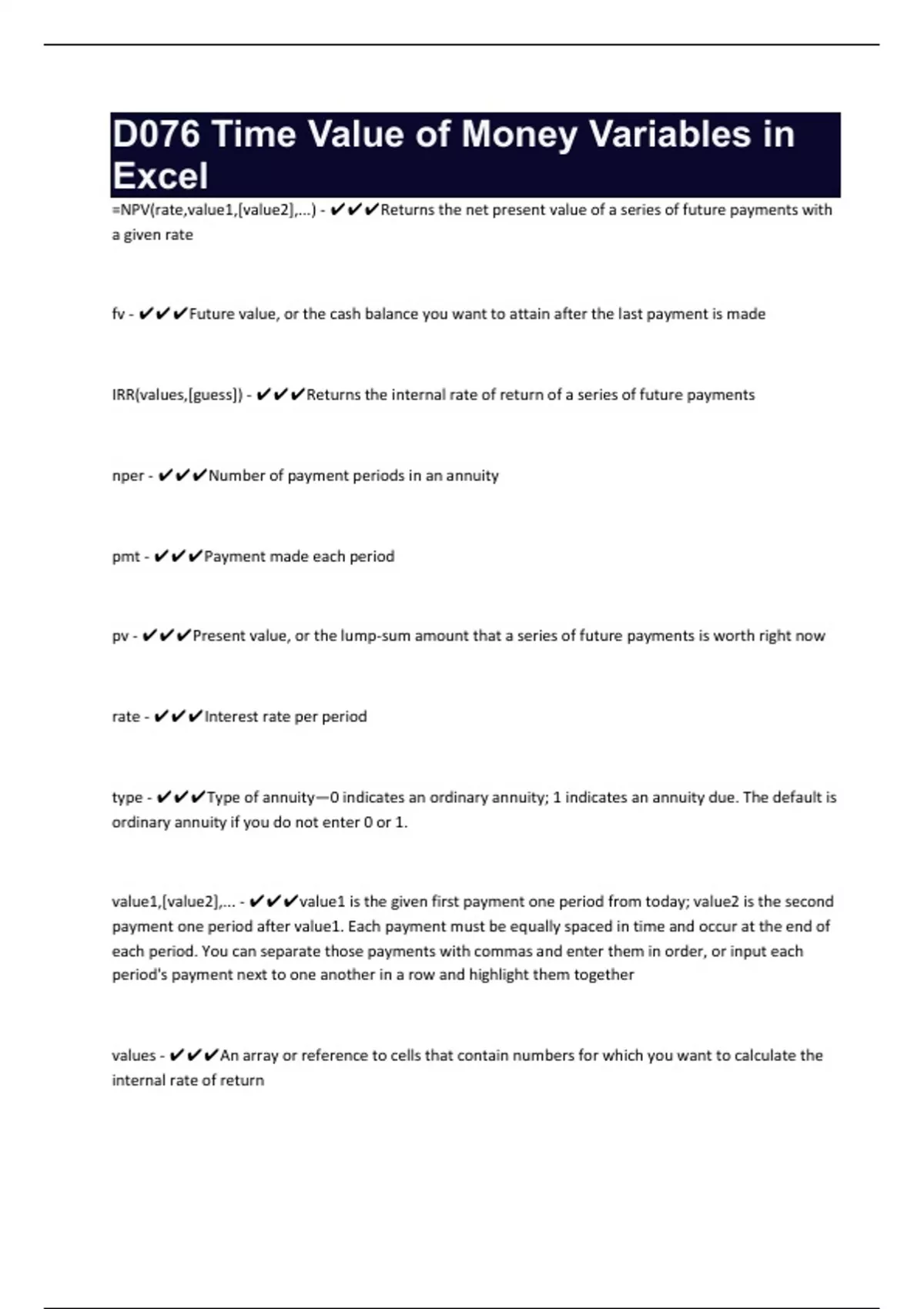 =NPV(rate,value1,[value2],...) - Returns the net present value of a series of future payments with a given rate fv - Future value, or the cash balance you want to attain after the last payment is made IRR(values,[guess]) - Returns the internal rate of return of a series of future payments nper - Number of payment periods in an annuity pmt - Payment made each period pv - Present value, or the lump-sum amount that a series of future payments is worth right now rate - Interest rate per period type - Type of annuity—0 indicates an ordinary annuity; 1 indicates an annuity due. The default is ordinary annuity if you do not enter 0 or 1.