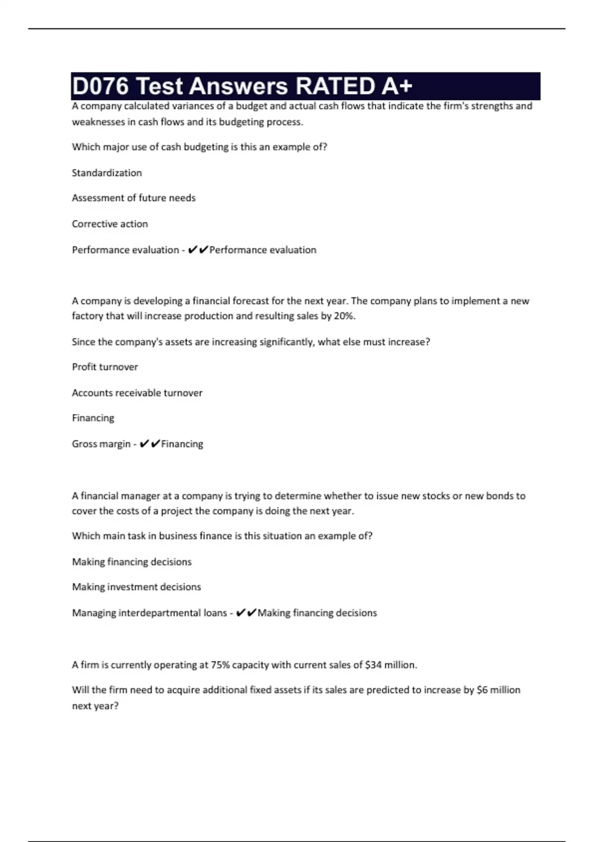 A company calculated variances of a budget and actual cash flows that indicate the firm's strengths and weaknesses in cash flows and its budgeting process. Which major use of cash budgeting is this an example of? Standardization Assessment of future needs Corrective action Performance evaluation - Performance evaluation A company is developing a financial forecast for the next year. The company plans to implement a new factory that will increase production and resulting sales by 20%. Since the company's assets are increasing significantly, what else must increase? Profit turnover Accounts receivable turnover Financing Gross margin - Financing A financial manager at a company is trying to determine whether to issue new stocks or new bonds to cover the costs of a project the company is doing the next year. Which main task in business finance is this situation an example of? Making financing decisions Making investment decisions Managing interdepartmental loans - Making financing decisions A firm is currently operating at 75% capacity with current sales of $34 million. Will the firm need to acquire additional fixed assets if its sales are predicted to increase by $6 million next year? No, because the increase in sales will exceed the firm's sales capacity. Yes, because the increase in sales will exceed the firm's sales capacity. Correct No, because the increase in sales will not exceed the firm's sales capacity. - No, because the increase in sales will not exceed the firm's sales capacity. A pharmaceutical company recently spent $2 million developing a new drug. The company then conducts capital budgeting analysis to determine if it should produce the newly developed drug. The net present value (NPV) of the project is $1.5 million. Why should this company produce the drug? Because the project will provide a total value of $3.5 million to the company Because the NPV is greater than zero Because the development costs are greater than the value of the project - Because the NPV is greater than zero A sign company is planning to have an initial public offering (IPO). In which type of market will its stock first be sold to the public? Efficient market Secondary market Money market Primary market - Primary market An employee was recently hired as a financial analyst and asked to create a cash budget for the employee's division for the next year. Which component should the employee exclude from the budget? Payment toward the line of credit that is due next month Purchase of equipment that will be bought in three years