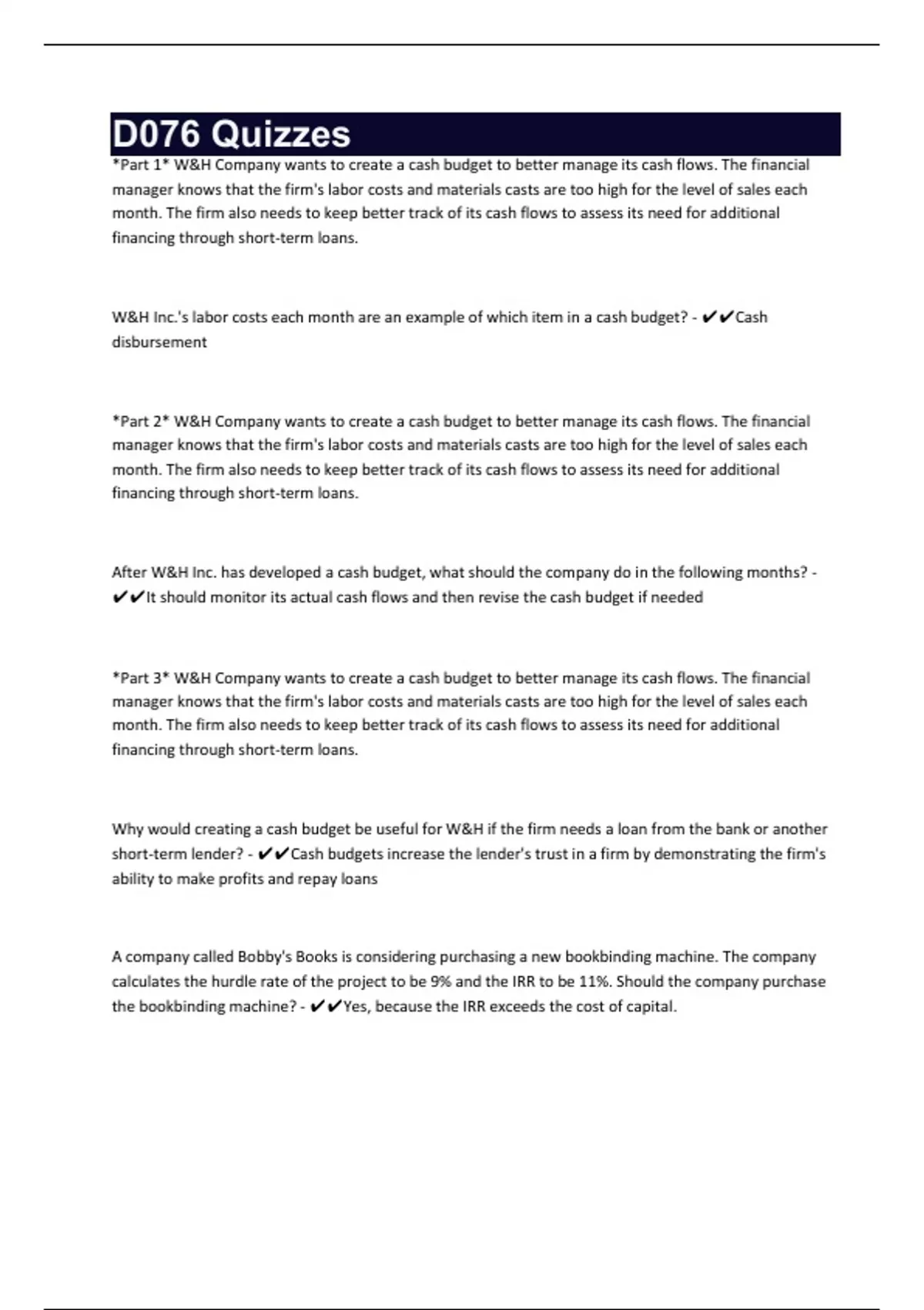 *Part 1* W&H Company wants to create a cash budget to better manage its cash flows. The financial manager knows that the firm's labor costs and materials casts are too high for the level of sales each month. The firm also needs to keep better track of its cash flows to assess its need for additional financing through short-term loans. W&H Inc.'s labor costs each month are an example of which item in a cash budget? - Cash disbursement *Part 2* W&H Company wants to create a cash budget to better manage its cash flows. The financial manager knows that the firm's labor costs and materials casts are too high for the level of sales each month. The firm also needs to keep better track of its cash flows to assess its need for additional financing through short-term loans. After W&H Inc. has developed a cash budget, what should the company do in the following months? - It should monitor its actual cash flows and then revise the cash budget if needed *Part 3* W&H Company wants to create a cash budget to better manage its cash flows. The financial manager knows that the firm's labor costs and materials casts are too high for the level of sales each month. The firm also needs to keep better track of its cash flows to assess its need for additional financing through short-term loans. Why would creating a cash budget be useful for W&H if the firm needs a loan from the bank or another short-term lender? - Cash budgets increase the lender's trust in a firm by demonstrating the firm's ability to make profits and repay loans A company called Bobby's Books is considering purchasing a new bookbinding machine. The company calculates the hurdle rate of the project to be 9% and the IRR to be 11%. Should the company purchase the bookbinding machine? - Yes, because the IRR exceeds the cost of capital. A company currently has a ratio of 1.5 but hopes to improve the ratio to 2 to align more with the industry benchmark. To achieve this goal, costs were cut in production through an investment in efficient equipment, and the company achieved a higher profit margin. If this continues, you are certain that the firm will achieve its goal in two years. What is this an example of? - Progress measurement A company is considering five projects that are not mutually exclusive. However, the company does not have enough money to do all of them In order to prioritize projects that fit within the company's budget, which capital budgeting method should be used? - Profitability Index (PI) A company is trying to decide which of four projects to invest in. Project 1 has IRR of 14% & NPV of $54,000 Project 2 has IRR of 11% & NPV of $67,000 Project 3 has IRR of 9% & NPV of $60,000 Project 4 has IRR of 13% & NPV of $47,000 If the company can only do one project, which project should it choose to add the greatest value to the firm? - Project 2. The project with the highest NPV will bring the most value to the company A company is trying to finance a project with a mortgage loan from a bank. The company's assessment of the project indicated that the company may experience several years of loss until the project becomes profitable. This means that the company might lost its ability to pay back the loan and the interest on the mortgage. What action might the bank take to protect its interest? - Set a strict covenant that the company cannot easily achieve. A company that produces soap, shampoo, lotion, and other personal care products has recently taken a hit due to a competitor's new product line. The company decides to reduce wages for its labor force to save money while the company focuses on building up its reputation again, but the company's labor force goes on strike to protest the pay cuts. What type of risk does the strike represent? - Idiosyncratic risk - same as firm-specific risk. Since the strike will most likely affect only this firm, it is a firm-specific risk A company's officers and board of directors are selling their stocks in the firm at higher prices due to false accounting reports that made the stock seem more valuable than it truly was. Which ethical issue is occurring in this situation? - Agency problem due to conflicting interests A financial analyst for the company Bobby's Books has been asked to evaluate a potential investment using a method that considers the time value of money. Is there more than one way to do this? - Yes, the analyst could use both the NPV and the IRR A firm had sales of $100,00 this month. However, the firm received only $90,000 in cash from sales. Why would the firm receive $10,000 less cash than its monthly sales? - Because the firm did not make all sales on cash A firm has paid off its short-term loans more quickly in the past couple of years. What might this trend indicate about the firm's financial ratios? - Its liquidity ratio is increasing A large corporation is looking to merge with another large corporation. Which financial institution can help them do this? - Investment bank A local start-up company just hit its five-year anniversary and is planning an initial public offering sometime this year. In order to issue public stock, which market will the company use? - Primary market A potential project to expand the size of an apartment complex will cost $100,000. Its calculate net present value is $5,000. Given this info, which statement is correct? - The project should be accepted because it has a positive NPV About a year ago, short-term Treasury bill had 1.54% interest & long-term Treasury note had 2.54% interest. This week, 1-year Treasury bill has interest rate of 3.13%, while 10-year Treasury note has an interest rate of 2.28%. What does this info indicate about the future economy? - It may indicate an economic downturn