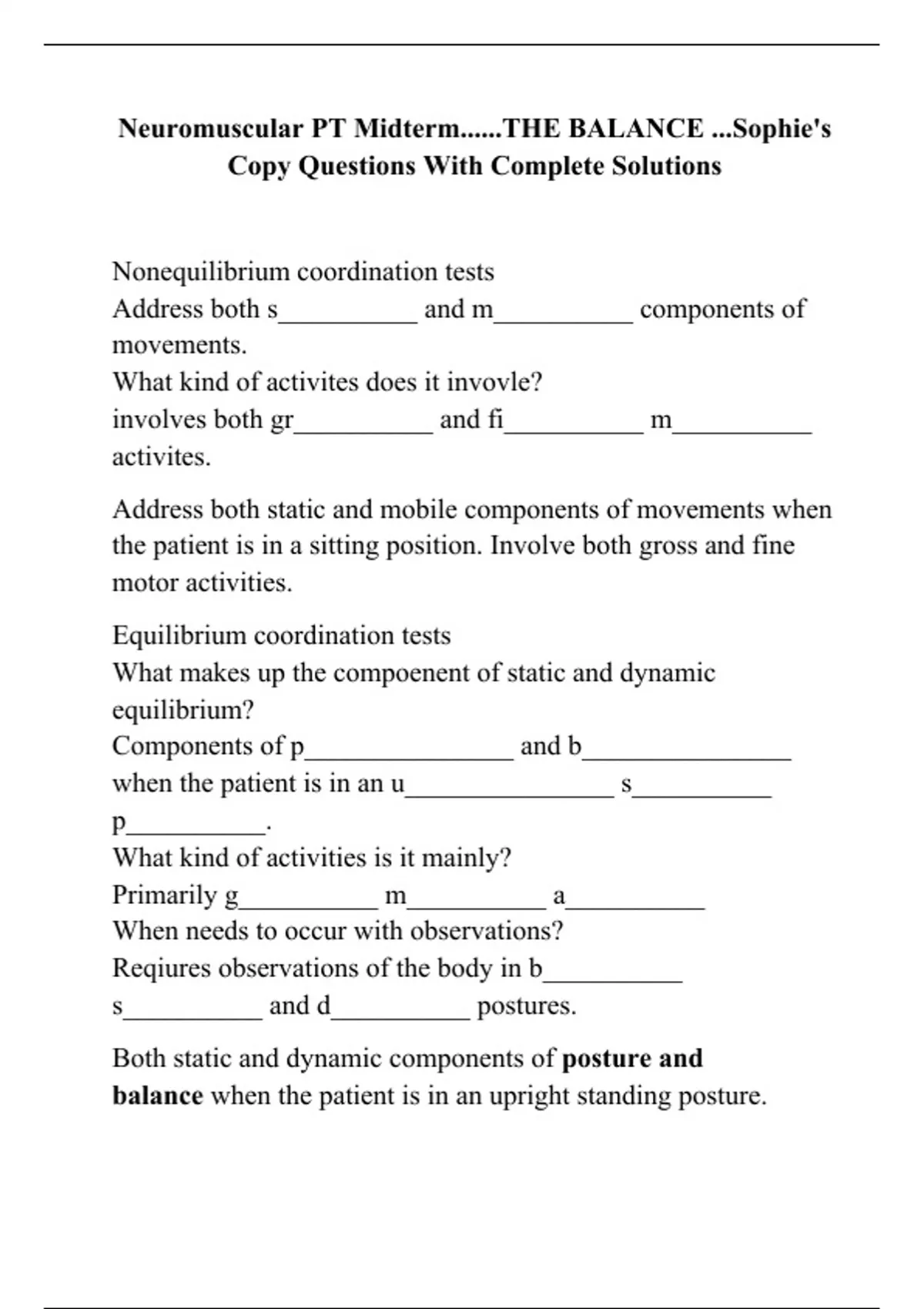 Neuromuscular PT Midterm......THE BALANCE ...Sophie's Copy Questions With Complete Solutions