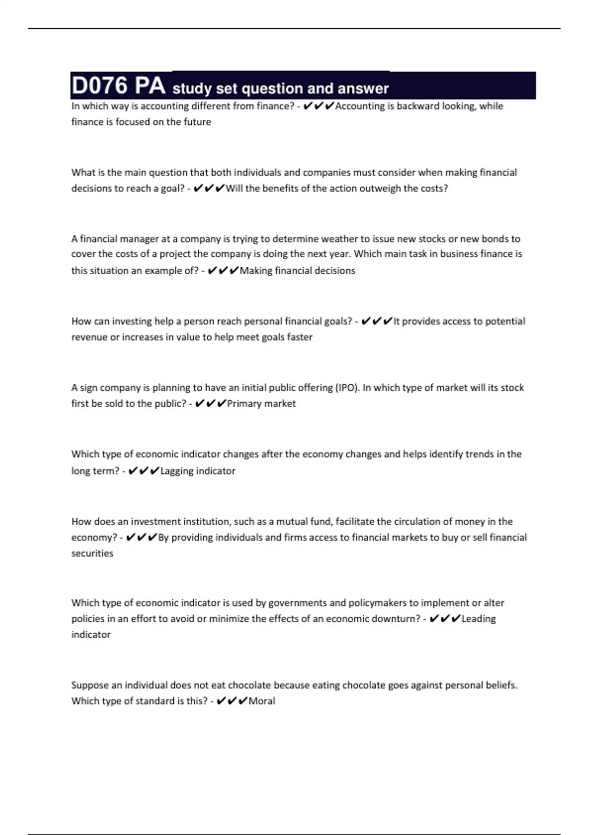 In which way is accounting different from finance? - Accounting is backward looking, while finance is focused on the future What is the main question that both individuals and companies must consider when making financial decisions to reach a goal? - Will the benefits of the action outweigh the costs? A financial manager at a company is trying to determine weather to issue new stocks or new bonds to cover the costs of a project the company is doing the next year. Which main task in business finance is this situation an example of? - Making financial decisions How can investing help a person reach personal financial goals? - It provides access to potential revenue or increases in value to help meet goals faster A sign company is planning to have an initial public offering (IPO). In which type of market will its stock first be sold to the public? - Primary market Which type of economic indicator changes after the economy changes and helps identify trends in the long term? - Lagging indicator How does an investment institution, such as a mutual fund, facilitate the circulation of money in the economy? - By providing individuals and firms access to financial markets to buy or sell financial securities Which type of economic indicator is used by governments and policymakers to implement or alter policies in an effort to avoid or minimize the effects of an economic downturn? - Leading indicator Suppose an individual does not eat chocolate because eating chocolate goes against personal beliefs. Which type of standard is this? - Moral What should a potential bondholder (lender) do to prevent a company (borrower) from taking on risky projects? - Set strict covenants that the company cannot uphold if it chooses a risky project What is the term for an individual's belief concerning what is and is not acceptable to personally do? - Morals Which factor contributes to the inflation of the prices of goods and services over time? - Increase in demand for goods and services Why can compounding interest be a good tool but also a significant detriment? - Compounding interest can be a good tool because it allows a lender to gain interest on interest, but it is a detriment because it causes a borrower to pay interest on interest Which component of the required rate of return takes into account the loss of potential gain from other alternatives? - Opportunity cost How is inflation calculated? - Inflation is calculated by determining the rate at which the average price level of particular goods and services increases over a period of time in an economy Standard deviation - A measure of dispersion that tells us how much scores in a sample differ from the mean of the sample What is the relationship between risk and return? - The higher risk an investor takes, the higher return the investor expects to receive An investor is considering purchasing stock in a certain company, but the investor's financial advisor suggests purchasing stocks in multiple companies instead of just one. Which risk management technique is this financial advisor suggesting? - Risk diversification