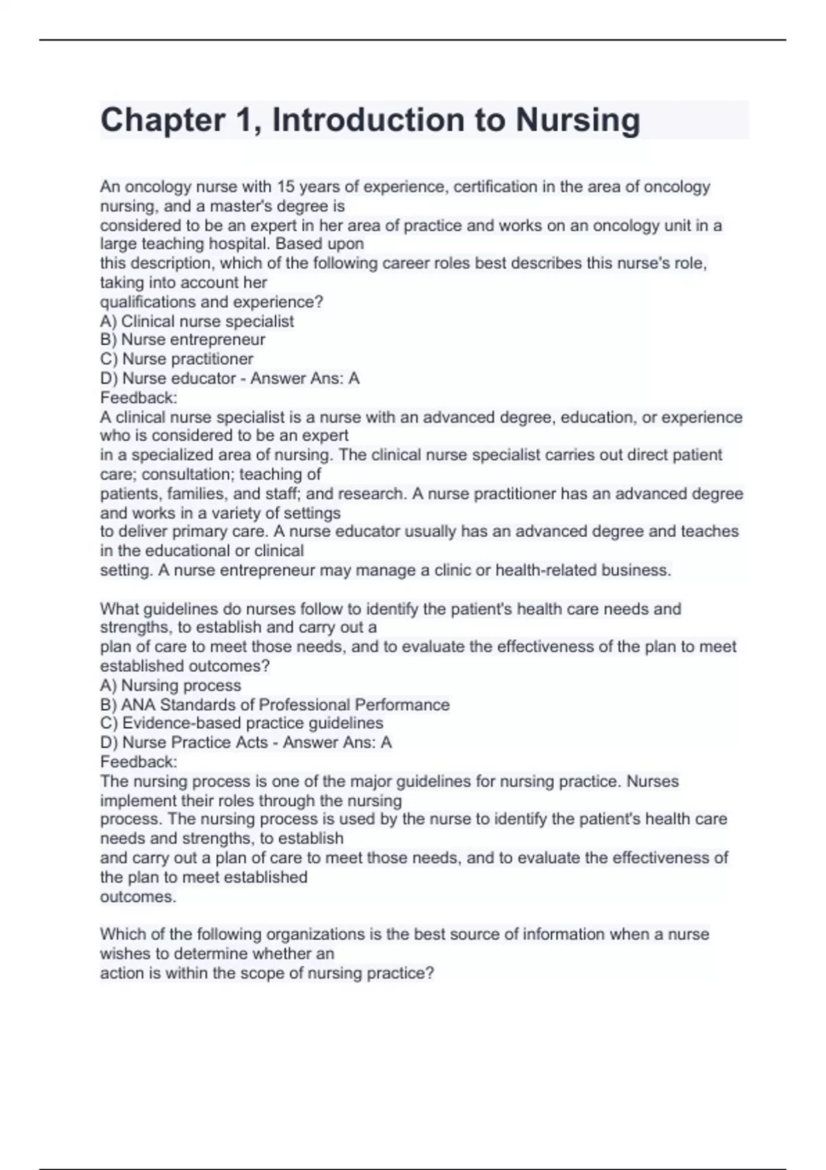 NUR 2243 Chapter 1 Nursing Fundamental Questions with Correct Solutions 2023/2024 An oncology nurse with 15 years of experience, certification in the area of oncology nursing, and a master's degree isvconsidered to be an expert in her area of practice and works on an oncology unit in a large teaching hospital. Based upon this description, which of the following career roles best describes this nurse's role, taking into account her qualifications and experience? A) Clinical nurse specialist B) Nurse entrepreneur C) Nurse practitioner D) Nurse educator - Answer Ans: A Feedback: A clinical nurse specialist is a nurse with an advanced degree, education, or experience who is considered to be an expert in a specialized area of nursing. The clinical nurse specialist carries out direct patient care; consultation; teaching of patients, families, and staff; and research. A nurse practitioner has an advanced degree and works in a variety of settings to deliver primary care. A nurse educator usually has an advanced degree and teaches in the educational or clinical setting. A nurse entrepreneur may manage a clinic or health-related business. What guidelines do nurses follow to identify the patient's health care needs and strengths, to establish and carry out a plan of care to meet those needs, and to evaluate the effectiveness of the plan to meet established outcomes? A) Nursing process B) ANA Standards of Professional Performance C) Evidence-based practice guidelines D) Nurse Practice Acts - Answer Ans: A Feedback: The nursing process is one of the major guidelines for nursing practice. Nurses implement their roles through the nursing process. The nursing process is used by the nurse to identify the patient's health care needs and strengths, to establish and carry out a plan of care to meet those needs, and to evaluate the effectiveness of the plan to meet established outcomes. Which of the following organizations is the best source of information when a nurse wishes to determine whether an action is within the scope of nursing practice? A) American Nurses Association (ANA) B) American Association of Colleges in Nursing (AACN) C) National League for Nursing (NLN) D) International Council of Nurses (ICN) - Answer Ans: A Feedback: The ANA produces the 2003 Nursing: Scope and Standards of Practice, which defines the activities specific and unique to nursing. The AACN addresses educational standards, while the NLN promotes and fosters various aspects of nursing. The ICN provides a venue for national nursing organizations to collaborate, but does not define standards and scope of practice. Who is considered to be the founder of professional nursing? A) Dorothea Dix B) Lillian Wald C) Florence Nightingale D) Clara Barton - Answer Ans: C Feedback: Florence Nightingale is considered to be the founder of professional nursing. She elevated the status of nursing to a respected occupation, improved the quality of nursing care, and founded modern nursing education. Although the other choices are women who were important to the development of nursing, none of them is considered the founder. Which of the following nursing pioneers established the Red Cross in the United States in 1882? A) Florence Nightingale B) Clara Barton C) Dorothea Dix D) Jane Addams - Answer Ans: B Feedback: Clara Barton volunteered to care for wounds and feed union soldiers during the civil war, served as the supervisor of nurses for the Army of the James, organized hospitals and nurses, and established the Red Cross in the United States in 1882. A nurse practitioner is caring for a couple who are the parents of an infant diagnosed with Down Syndrome. The nurse makes referrals for a parent support group for the family. This is an example of which nursing role? A) Teacher/Educator B) Leader C) Counselor D) Collaborator - Answer Ans: C Feedback: Counseling skills involve the use of therapeutic interpersonal communication skills to provide information, make appropriate referrals, and facilitate the patient's problem-solving and decision-making skills. The teacher/educator uses communication skills to assess, implement, and evaluate individualized teaching plans to meet learning needs of clients and their families. A leader displays an assertive, self-confident practice of nursing when providing care, effecting change, and functioning with groups. The collaborator uses skills in organization, communication, and advocacy to facilitate the functions of all members of the health care team as they provide patient care.