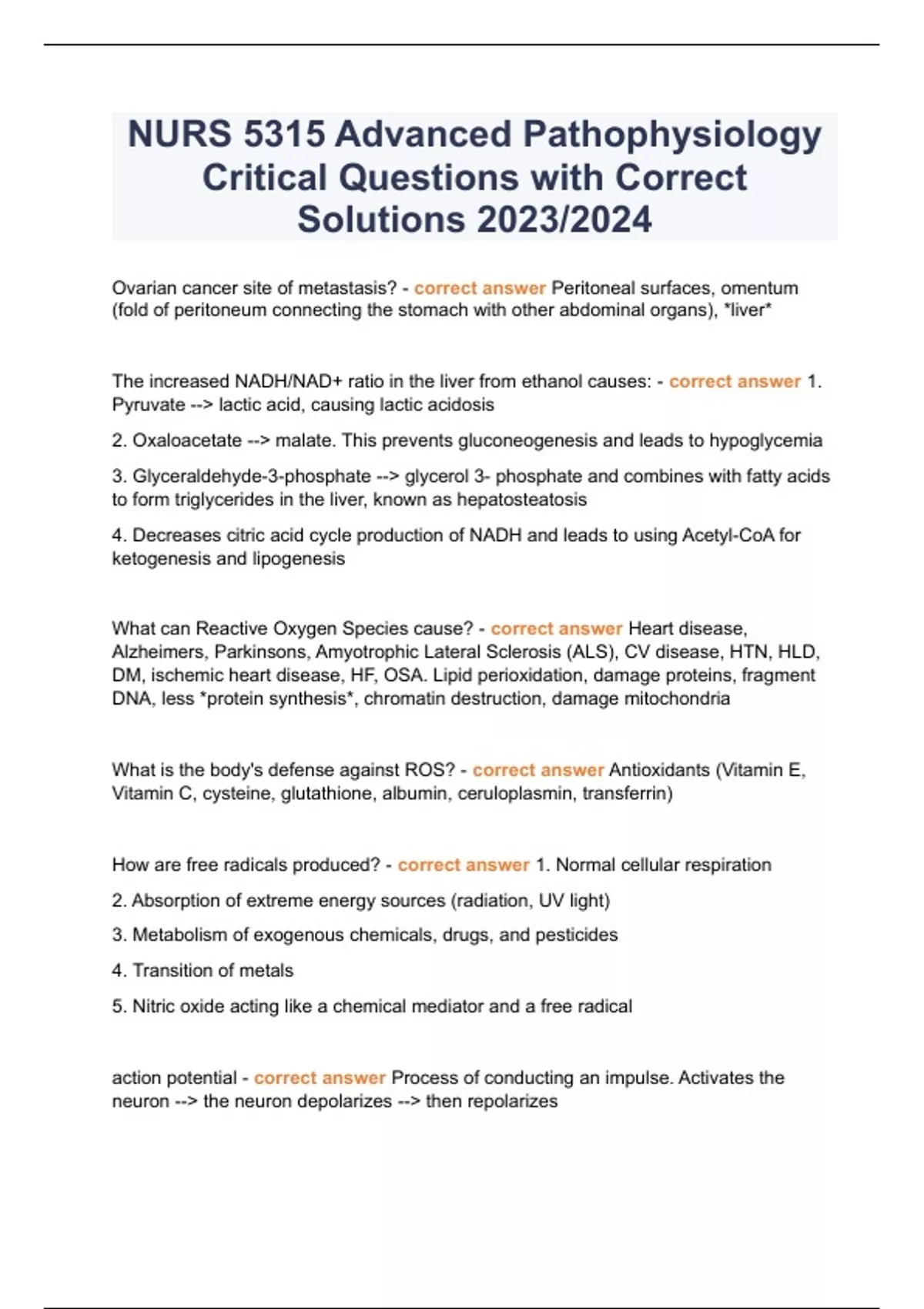 NURS 5315 Advanced Pathophysiology Critical Questions with Correct Solutions 2023/2024 Ovarian cancer site of metastasis? - correct answer Peritoneal surfaces, omentum (fold of peritoneum connecting the stomach with other abdominal organs), *liver* The increased NADH/NAD+ ratio in the liver from ethanol causes: - correct answer 1. Pyruvate -- lactic acid, causing lactic acidosis 2. Oxaloacetate -- malate. This prevents gluconeogenesis and leads to hypoglycemia 3. Glyceraldehyde-3-phosphate -- glycerol 3- phosphate and combines with fatty acids to form triglycerides in the liver, known as hepatosteatosis 4. Decreases citric acid cycle production of NADH and leads to using Acetyl-CoA for ketogenesis and lipogenesis What can Reactive Oxygen Species cause? - correct answer Heart disease, Alzheimers, Parkinsons, Amyotrophic Lateral Sclerosis (ALS), CV disease, HTN, HLD, DM, ischemic heart disease, HF, OSA. Lipid perioxidation, damage proteins, fragment DNA, less *protein synthesis*, chromatin destruction, damage mitochondria What is the body's defense against ROS? - correct answer Antioxidants (Vitamin E, Vitamin C, cysteine, glutathione, albumin, ceruloplasmin, transferrin) How are free radicals produced? - correct answer 1. Normal cellular respiration 2. Absorption of extreme energy sources (radiation, UV light) 3. Metabolism of exogenous chemicals, drugs, and pesticides 4. Transition of metals 5. Nitric oxide acting like a chemical mediator and a free radical action potential - correct answer Process of conducting an impulse. Activates the neuron -- the neuron depolarizes -- then repolarizes Threshold potential - correct answer Point at which depolarization must reach in order to initiate an action potential Hypokalemia and action potentials - correct answer HYPERpolarized (more negative, ex. -100). Less excitable. Decreased neuromuscular excitability: weakness, smooth muscle atony, paresthesia, cardiac dysrhythmias Hyperkalemia and action potentials - correct answer HYPOpolarized (more positive, ex: closer to 0). More excitable. Peaked T waves. When resting membrane potential=threshold potential, it is BAD = cardiac standstill, paresthesia, paralysis Hypocalcemia and action potentials - correct answer Increased permeability to Na+. More excitable. Tetany, hyperreflexia, circumoral paresthesia, seizures, dysrhythmias. Hypercalcemia and action potentials - correct answer Decreased permeability to Na+. Less excitable. Weakness, hyporeflexia, fatigue, lethargy, confusion, encephalopathy, depressed T waves Atrophy - correct answer Occurs as a result of decrease in work load, pressure, use, blood supply, nutrition, hormonal stimulation, or nervous stimulation. Once the cell has decreased in size, it has now compensated for decreased blood supply, nerve supply, nutrient supply, hormonal supply, and has achieved new homeostasis. Cells are alive but have diminished function and may lead to cellular death.