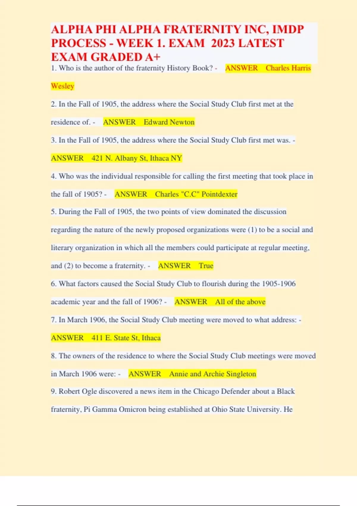1. Who is the author of the fraternity History Book? - ANSWER Charles Harris Wesley 2. In the Fall of 1905, the address where the Social Study Club first met at the residence of. - ANSWER Edward Newton 3. In the Fall of 1905, the address where the Social Study Club first met was. - ANSWER 421 N. Albany St, Ithaca NY 4. Who was the individual responsible for calling the first meeting that took place in the fall of 1905? - ANSWER Charles "C.C" Pointdexter 5. During the Fall of 1905, the two points of view dominated the discussion regarding the nature of the newly proposed organizations were (1) to be a social and literary organization in which all the members could participate at regular meeting, and (2) to become a fraternity. - ANSWER True 6. What factors caused the Social Study Club to flourish during the academic year and the fall of 1906? - ANSWER All of the above 7. In March 1906, the Social Study Club meeting were moved to what address: - ANSWER 411 E. State St, Ithaca 8. The owners of the residence to where the Social Study Club meetings were moved in March 1906 were: - ANSWER Annie and Archie Singleton 9. Robert Ogle discovered a news item in the Chicago Defender about a Black fraternity, Pi Gamma Omicron being established at Ohio State University. He