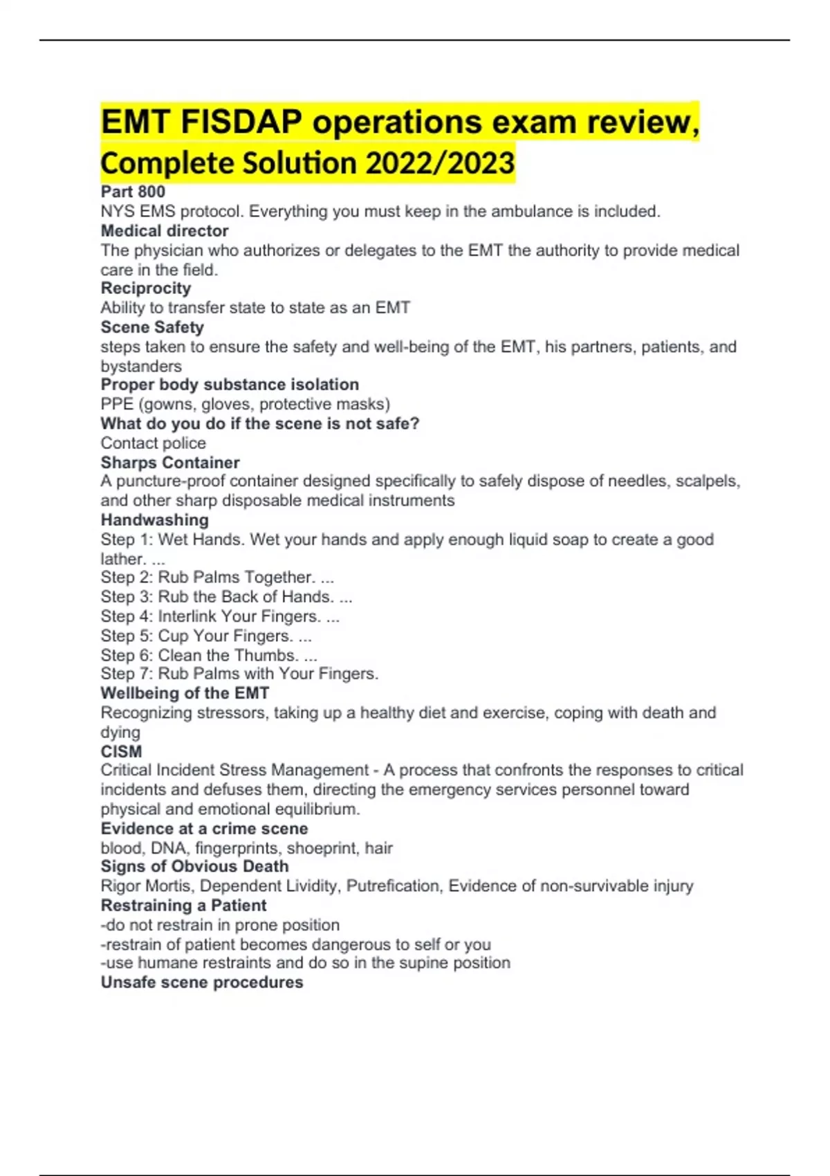 EMT FISDAP operations exam review, Complete Solution 2022/2023 Part 800 NYS EMS protocol. Everything you must keep in the ambulance is included. Medical director The physician who authorizes or delegates to the EMT the authority to provide medical care in the field. Reciprocity Ability to transfer state to state as an EMT Scene Safety steps taken to ensure the safety and well-being of the EMT, his partners, patients, and bystanders Proper body substance isolation PPE (gowns, gloves, protective masks) What do you do if the scene is not safe? Contact police Sharps Container A puncture-proof container designed specifically to safely dispose of needles, scalpels, and other sharp disposable medical instruments Handwashing Step 1: Wet Hands. Wet your hands and apply enough liquid soap to create a good lather. ... Step 2: Rub Palms Together. ... Step 3: Rub the Back of Hands. ... Step 4: Interlink Your Fingers. ... Step 5: Cup Your Fingers. ... Step 6: Clean the Thumbs. ... Step 7: Rub Palms with Your Fingers. Wellbeing of the EMT Recognizing stressors, taking up a healthy diet and exercise, coping with death and dying CISM Critical Incident Stress Management - A process that confronts the responses to critical incidents and defuses them, directing the emergency services personnel toward physical and emotional equilibrium. Evidence at a crime scene blood, DNA, fingerprints, shoeprint, hair Signs of Obvious Death Rigor Mortis, Dependent Lividity, Putrefication, Evidence of non-survivable injury Restraining a Patient -do not restrain in prone position -restrain of patient becomes dangerous to self or you -use humane restraints and do so in the supine position Unsafe scene procedures Expressed Consent (actual consent) Type of consent given when patient verbally or otherwise acknowledge that he or she wants you to provide care or transport. Implied consent Type of consent in which a patient who is unable to give consent is given treatment under the legal assumption that he or she would want treatment. Informed consent includes Risks, benefits, complications, alternatives DNR do not resuscitate order MOLST medical orders for life sustaining treatment- a medical order form that tells others the patient's medical orders for life-sustaining treatment Informed refusal Occurs when the patient refuses treatment after he/she has been fully educated regarding the consequences of not receiving the treatment. RMA The refusal of medical assistance, or RMA, ensures the continuum of care that ambulance squads have a responsibility towards. In a typical emergency call, the ambulance service will assess and transport the patient to an appropriate facility. Standing orders a policy or protocol issued by a Medical Director that authorizes EMTs and others to perform particular skills in certain situations Medical control Physician instructions that are given directly by radio or cell phone (online/direct) or indirectly by protocol/guidelines (off-line/indirect), as authorized by the medical director of the service program. Libel A written defamation of a person's character, reputation, business, or property rights. HIPPA Health Insurance Portability and Accountability Act ensures the privacy of all patients START triage A patient sorting process that stands for Simple Triage And Rapid Treatment and uses a limited assessment of the patient's ability to walk, respiratory status, hemodynamic status, and neurologic status. scene size-up A step within the patient assessment process that involves a quick assessment of the scene and the surroundings to provide information about scene safety and the mechanism of injury or nature of illness before you enter and begin patient care. General impression impression of the patient's condition that is formed on first approaching the patient, based on the patient's environment, chief complaint, and appearance. Additional Resources Assess if ALS is needed Assess if Law Enforcement is needed Assess if Fire Department is needed