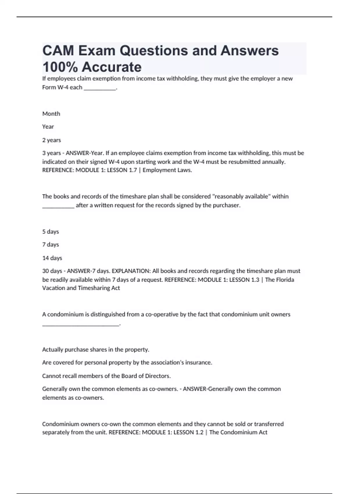 If employees claim exemption from income tax withholding, they must give the employer a new Form W-4 each __________. Month Year 2 years 3 years - ANSWER-Year. If an employee claims exemption from income tax withholding, this must be indicated on their signed W-4 upon starting work and the W-4 must be resubmitted annually. REFERENCE: MODULE 1: LESSON 1.7 | Employment Laws. The books and records of the timeshare plan shall be considered "reasonably available" within __________ after a written request for the records signed by the purchaser. 5 days 7 days 14 days 30 days - ANSWER-7 days. EXPLANATION: All books and records regarding the timeshare plan must be readily available within 7 days of a request. REFERENCE: MODULE 1: LESSON 1.3 | The Florida Vacation and Timesharing Act A condominium is distinguished from a co-operative by the fact that condominium unit owners ________________________. Actually purchase shares in the property. Are covered for personal property by the association's insurance. Cannot recall members of the Board of Directors. Generally own the common elements as co-owners. - ANSWER-Generally own the common elements as co-owners. Condominium owners co-own the common elements and they cannot be sold or transferred separately from the unit. REFERENCE: MODULE 1: LESSON 1.2 | The Condominium Act