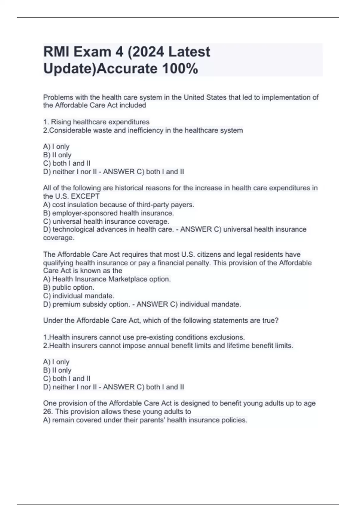 Problems with the health care system in the United States that led to implementation of the Affordable Care Act included 1. Rising healthcare expenditures 2.Considerable waste and inefficiency in the healthcare system A) I only B) II only C) both I and II D) neither I nor II - ANSWER C) both I and II All of the following are historical reasons for the increase in health care expenditures in the U.S. EXCEPT A) cost insulation because of third-party payers. B) employer-sponsored health insurance. C) universal health insurance coverage. D) technological advances in health care. - ANSWER C) universal health insurance coverage. The Affordable Care Act requires that most U.S. citizens and legal residents have qualifying health insurance or pay a financial penalty. This provision of the Affordable Care Act is known as the A) Health Insurance Marketplace option. B) public option. C) individual mandate. D) premium subsidy option. - ANSWER C) individual mandate. Under the Affordable Care Act, which of the following statements are true? 1.Health insurers cannot use pre-existing conditions exclusions. 2.Health insurers cannot impose annual benefit limits and lifetime benefit limits. A) I only B) II only C) both I and II D) neither I nor II - ANSWER C) both I and II One provision of the Affordable Care Act is designed to benefit young adults up to age 26. This provision allows these young adults to A) remain covered under their parents' health insurance policies. B) receive a tax credit for their health insurance premium if they are unemployed. C) receive low-interest government loans to finance their health insurance. D) receive coverage under Medicare if they are not covered by a private health insurance plan. - ANSWER A) remain covered under their parents' health insurance policies. Which of the following statements regarding health care expenditures in the United States is (are) true? 1.As a nation, the U.S. spends significantly more per-person on health care than most other industrialized nations. 2.Health care expenditures in the U.S. are high because everyone is covered by a health insurance plan. A) I only B) II only C) both I and II D) neither I nor II - ANSWER A) I only Individual medical expense insurance sold in the Health Insurance Marketplace is characterized by which of the following? A) narrow range of benefits
