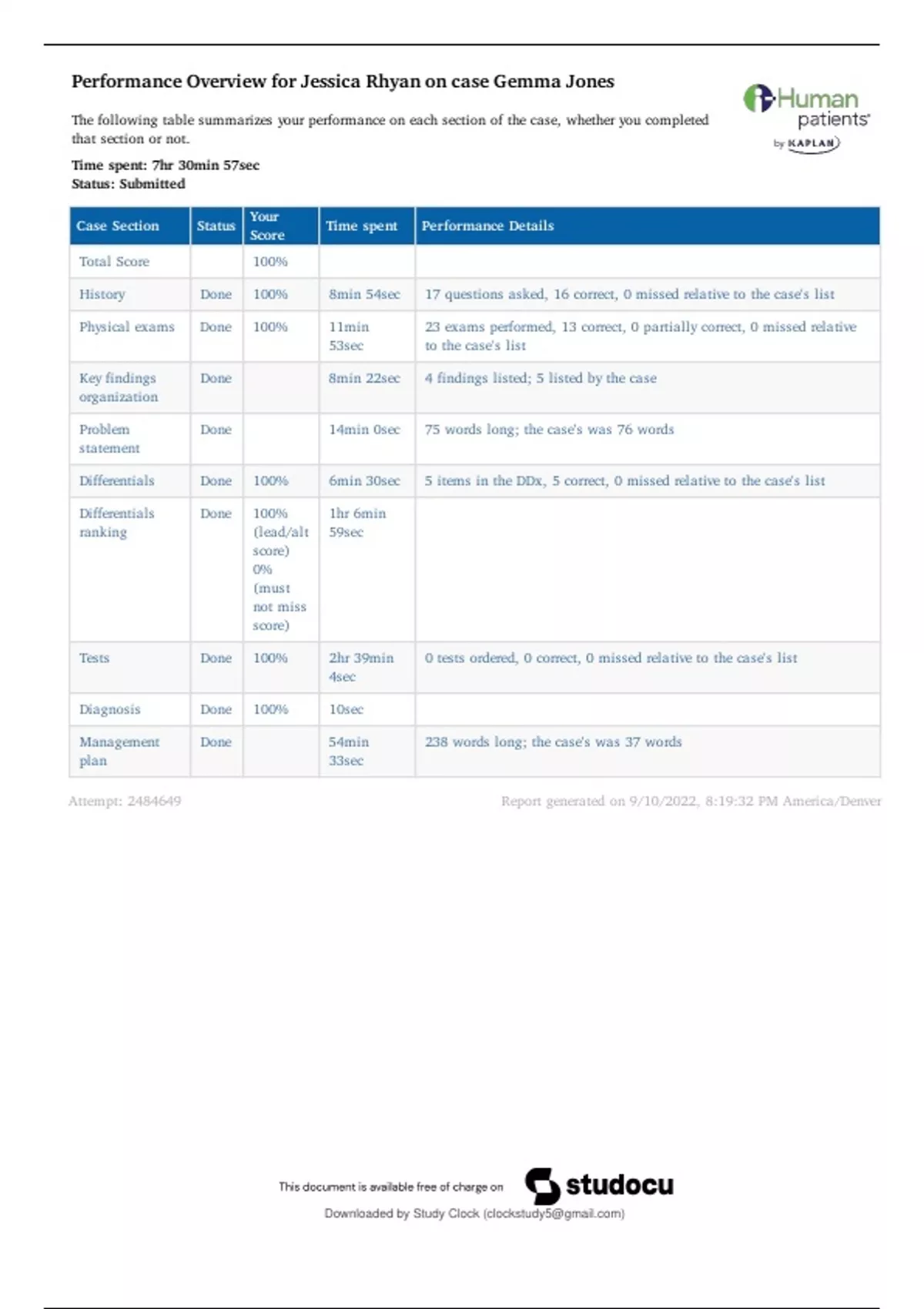 Performance Overview for Jessica Rhyan on case Gemma Jones Total Score 100% History Done 100% 8min 54sec 17 questions asked, 16 correct, 0 missed relative to the case's list Physical exams Done 100% 11min 53sec 23 exams performed, 13 correct, 0 partially correct, 0 missed relative to the case's list Key findings organization Done 8min 22sec 4 findings listed; 5 listed by the case Problem statement Done 14min 0sec 75 words long; the case's was 76 words Differentials Done 100% 6min 30sec 5 items in the DDx, 5 correct, 0 missed relative to the case's list Differentials ranking Done 100% (lead/alt score) 0% (must not miss score) 1hr 6min 59sec Tests Done 100% 2hr 39min 4sec 0 tests ordered, 0 correct, 0 missed relative to the case's list Diagnosis Done 100% 10sec Management plan Done 54min 33sec 238 words long; the case's was 37 word