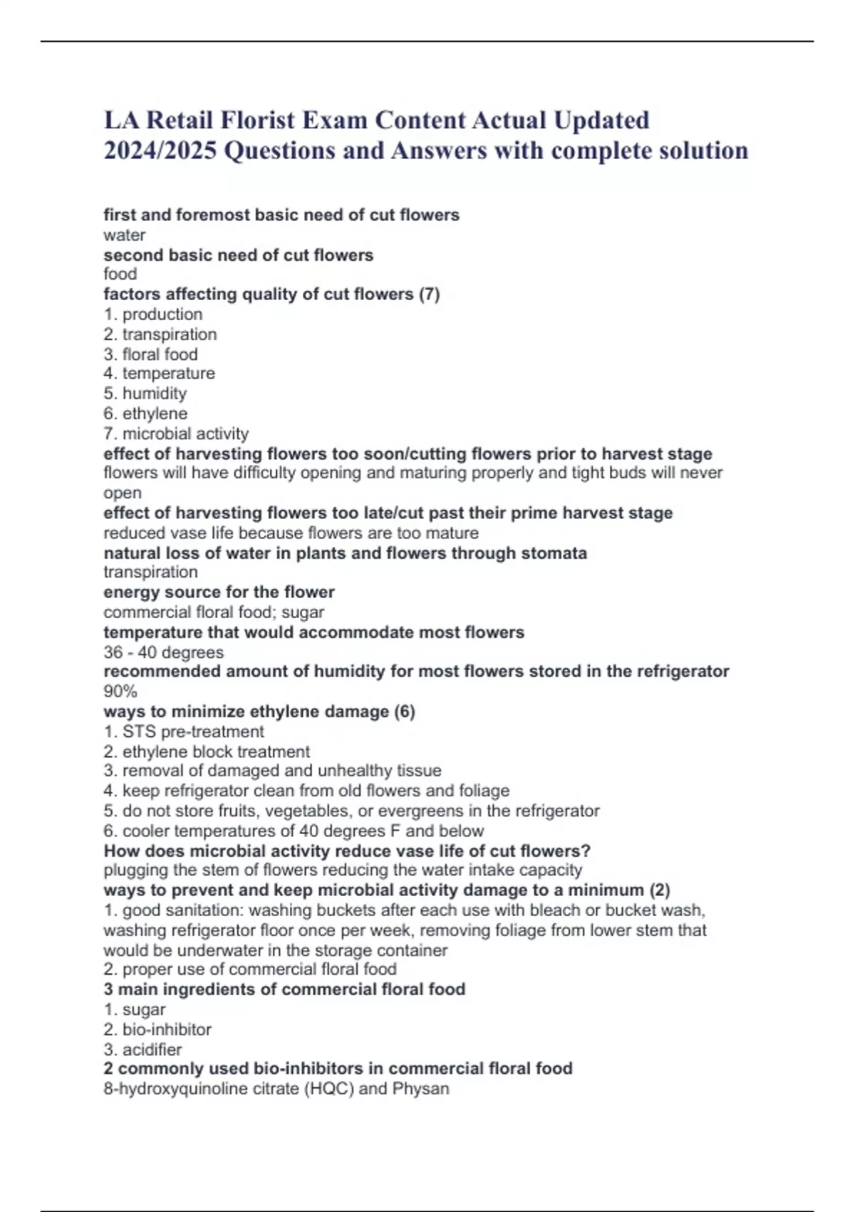LA Retail Florist Exam Content Actual Updated 2024/2025 Questions and Answers with complete solution first and foremost basic need of cut flowers water second basic need of cut flowers food factors affecting quality of cut flowers (7) 1. production 2. transpiration 3. floral food 4. temperature 5. humidity 6. ethylene 7. microbial activity effect of harvesting flowers too soon/cutting flowers prior to harvest stage flowers will have difficulty opening and maturing properly and tight buds will never open effect of harvesting flowers too late/cut past their prime harvest stage reduced vase life because flowers are too mature natural loss of water in plants and flowers through stomata transpiration energy source for the flower commercial floral food; sugar temperature that would accommodate most flowers 36 - 40 degrees recommended amount of humidity for most flowers stored in the refrigerator 90% ways to minimize ethylene damage (6) 1. STS pre-treatment 2. ethylene block treatment 3. removal of damaged and unhealthy tissue 4. keep refrigerator clean from old flowers and foliage 5. do not store fruits, vegetables, or evergreens in the refrigerator 6. cooler temperatures of 40 degrees F and below How does microbial activity reduce vase life of cut flowers? plugging the stem of flowers reducing the water intake capacity ways to prevent and keep microbial activity damage to a minimum (2) 1. good sanitation: washing buckets after each use with bleach or bucket wash, washing refrigerator floor once per week, removing foliage from lower stem that would be underwater in the storage container 2. proper use of commercial floral food 3 main ingredients of commercial floral food 1. sugar 2. bio-inhibitor 3. acidifier 2 commonly used bio-inhibitors in commercial floral food 8-hydroxyquinoline citrate (HQC) and Physan