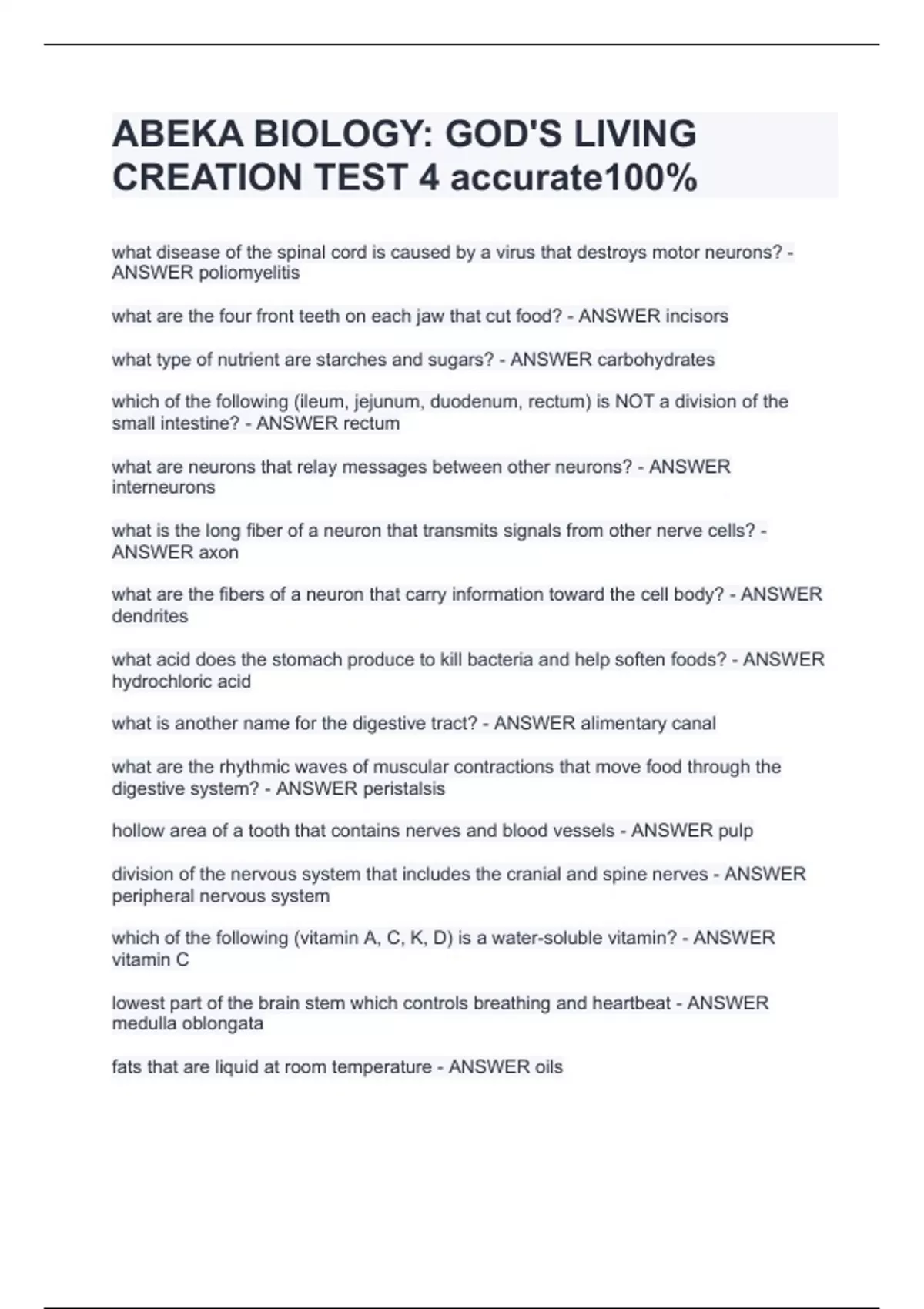 ABEKA BIOLOGY: GOD'S LIVING CREA what disease of the spinal cord is caused by a virus that destroys motor neurons? - ANSWER poliomyelitis what are the four front teeth on each jaw that cut food? - ANSWER incisors what type of nutrient are starches and sugars? - ANSWER carbohydrates which of the following (ileum, jejunum, duodenum, rectum) is NOT a division of the small intestine? - ANSWER rectum what are neurons that relay messages between other neurons? - ANSWER interneurons what is the long fiber of a neuron that transmits signals from other nerve cells? - ANSWER axon what are the fibers of a neuron that carry information toward the cell body? - ANSWER dendrites what acid does the stomach produce to kill bacteria and help soften foods? - ANSWER hydrochloric acid what is another name for the digestive tract? - ANSWER alimentary canal what are the rhythmic waves of muscular contractions that move food through the digestive system? - ANSWER peristalsis hollow area of a tooth that contains nerves and blood vessels - ANSWER pulp division of the nervous system that includes the cranial and spine nerves - ANSWER peripheral nervous system which of the following (vitamin A, C, K, D) is a water-soluble vitamin? - ANSWER vitamin TION TEST 4 accurate100%