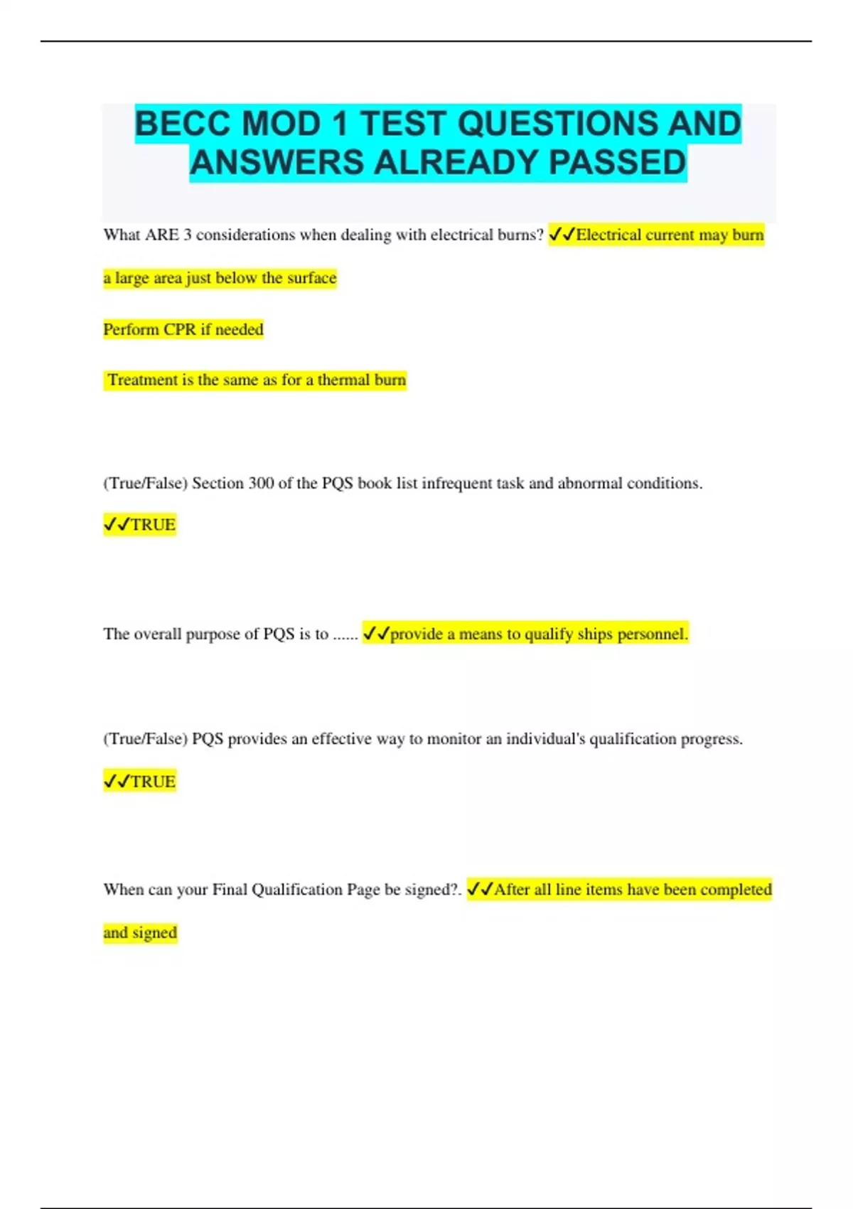 BECC MOD 1 TEST QUESTIONS AND ANSWERS ALREADY PASSED What ARE 3 considerations when dealing with electrical burns? Electrical current may burn a large area just below the surface Perform CPR if needed Treatment is the same as for a thermal burn (True/False) Section 300 of the PQS book list infrequent task and abnormal conditions. TRUE The overall purpose of PQS is to ...... provide a means to qualify ships personnel. (True/False) PQS provides an effective way to monitor an individual's qualification progress. TRUE When can your Final Qualification Page be signed?. After all line items have been completed and signed Vocabulary used in each qualification can be found in the ....... Section of the PQS book. FUNDAMENTALS Progress and completed qualifications of each person in the division are displayed on/in the ....... PROGRESS CHART Who is the final qualification authority? COMMANDING OFFICER A five inch outside micrometer will measure objects that are ....... inches thick. 4-5IN A Dial indicator may be used to....... ALIGN MACHINERY It is NOT safe to operate electrical power tools in areas where ....... is/are present. FLAMMABLE GASES Electrical power tools must be inspected prior to issue by a qualified ....... ELECTRICIAN A torque wrench is used to measure the tightness of ... FASTENERS Torque wrenches are considered ....... equipment PRECISION If a maintenance procedure does not specify a torque sequence, utilize the recommended sequence found in ....... NTM CHAPER 075 Which document contains maintenance requirements pertaining to all equipment in a command? PMS MASTER FILE 16. Which portion of the PMS Master File provides the work center supervisor a ready reference of planned maintenance requirements.? WORK CENTER PMS MANUAL If a planned maintenance action cannot be completed in accordance with the steps listed on the MRC, the maintenance man should ....... STOP AND REPORT TO THE WCS What is used to notify personnel that death or injury may result if the operating procedures and practices are NOT correctly followed? Warnings Which of the following serves as the "Table of Contents" for the Work Center PMS manual? LIST OF EFFECTIVE PAGES (LOEP) The SYSCOM Control Number assigned for each maintenance requirement listed in a MIP must match the number on the corresponding MRC (maintenance requirement card) Materials needed to perform the required maintenance are found on the FRONT OF THE MRC The responsibility to replace a missing MRC belongs to the ....... WORK CENTER SUPERVISOR Who assists the Department Head in managing maintenance at the division level? DIVISION OFFICER Who has the responsibility to maintain the list of effective pages? WORK CENTER SUPERVISOR Which schedule is NOT used in the 3M system? DAILY Which of the following periodicity code is used when a maintenance requirement is performed monthly? M Which document is use to verify that you have the proper MRC? MIP (MAINTENANCE INDEX PAGE) You must check the ...... to ensure that the weekly schedule