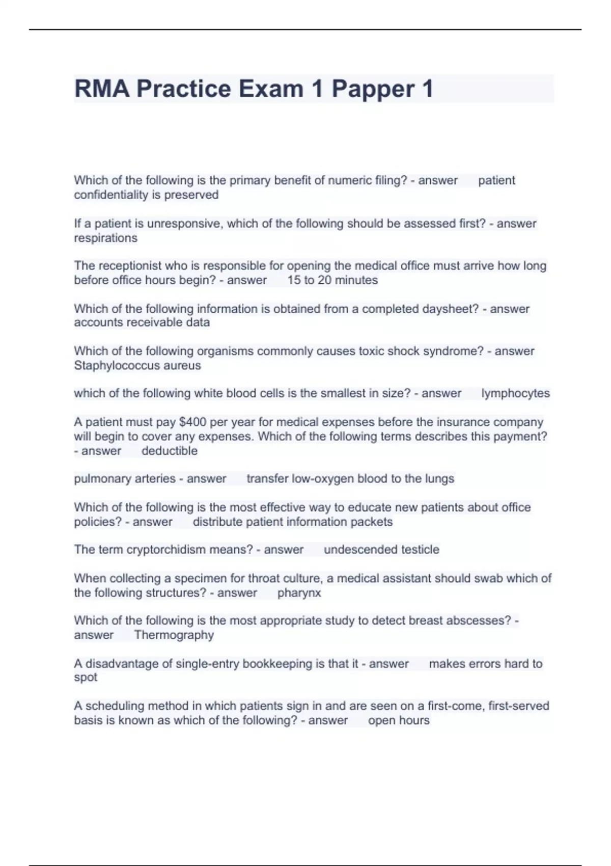 RMA Practice Exam 1 Papper 1 Questions with Complete Answers