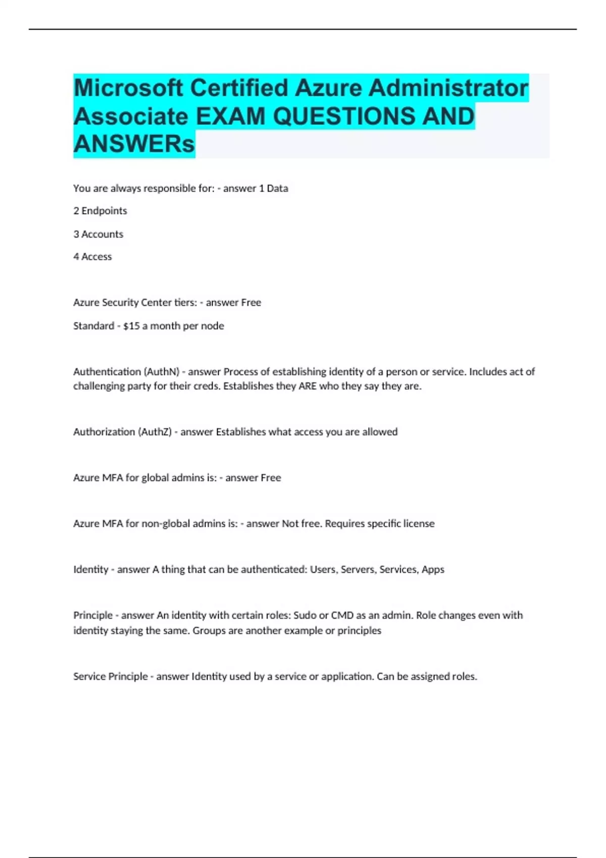 You are always responsible for: 1 Data 2 Endpoints 3 Accounts 4 Access Azure Security Center tiers: Free Standard - $15 a month per node Authentication (AuthN) Process of establishing identity of a person or service. Includes act of challenging party for their creds. Establishes they ARE who they say they are. Authorization (AuthZ) Establishes what access you are allowed Azure MFA for global admins is: Free Azure MFA for non-global admins is: Not free. Requires specific license Identity A thing that can be authenticated: Users, Servers, Services, Apps Principle An identity with certain roles: Sudo or CMD as an admin. Role changes even with identity staying the same. Groups are another example or principles Service Principle Identity used by a service or application. Can be assigned roles. Role-Based Access Control (RBAC) Roles are sets of permissions, users are assigned to roles; users are assigned to groups and the group are assigned to roles. Like editor or read only. Can be granted to access an Azure service instance Privileged Identity Management (PIM) A paid for service that provides oversight of role assignments, self-service and just in time role activation Symmetric encryption Uses a single key to encrypt and decrypt data. Asymmetric encryption Two keys are used; one key encodes the message, and the other key decodes the message. Used for Transport Layer Security (TLS) which is used for HTTPS and data signing Azure Storage Service Encryption Data at rest encryption. Used for Blob storage, Azure files, etc Azure Disk Encryption Encrypts windows or linux IaaS VM disks. Uses bitlocker feature of Windows and the dm-crypt feature of Linux to provide encryption for the OS and data disk. Integrated into Azure Key Vault Transport Data Encryption (TDE) Helps protect Azure SQL database and Azure Data Warehouse. Enabled by default. You can use Azure Key Vault key or bring your own key (BYOK) Azure Key Vault - Secret management, tokens, passwords, certs, API keys etc. - Key management, encryption keys - Certificate management, manage and use your SSL/TLS certs for your Azure and internally connected services - Store secrets backed by hardware security modules (HSM). Can use software or FIPS HSM Benefits of Azure Key Vault include - Centralized app secrets - Securely stored secrets and keys - Monitor access and use - Simplify admin of app secrets - Integrate with other Azure services X.509 v3 Certs used in Azure Firewall Grants access based on IP. Can check port and protocol also Azure Firewall Managed. Cloud based. Fully stateful. Built with high availability and unrestricted cloud scalability. Protects against inbound non-HTTP/S protocols like RDP, SSH and FTP. Also provides outbound network level protection for all ports and protocols and application level protection for outbound HTTP/S Azure App Gateway A load balancer that includes a Web App Firewall (WAF) that protects against common known vulnerabilities in websites. Designed for HTTP traffic Network Virtual Appliance (NVA) Ideal options for non-HTTP services on advanced configurations. Similar to hardware firewalls Azure DDoS protection Monitors traffic at the Azure network edge before it effects availability. It identifies DDoS traffic and blocks it while allowing legit traffic Azure DDoS Protection: Basic tier Auto enabled in Azure. Always on monitoring. Real time monitoring/mitigation of common network level attacks. Azure DDoS protection: Standard tier Additional mitigation capabilities tuned specifically to Azure Virtual Network resources. Requires no app changes. Dedicated traffic monitoring. Machine learning. Mitigate against: volumetric attacks, protocol attacks, resource