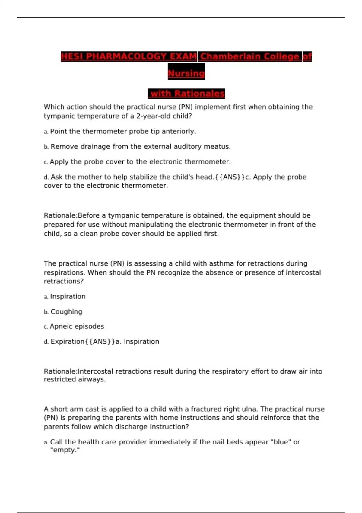 HESI PHARMACOLOGY EXAM Chamberlain College of Nursing with Rationales Which action should the practical nurse (PN) implement first when obtaining the tympanic temperature of a 2-year-old child? a. Point the thermometer probe tip anteriorly. b. Remove drainage from the external auditory meatus. c. Apply the probe cover to the electronic thermometer. d. Ask the mother to help stabilize the child's head.{{ANS}}c. Apply the probe cover to the electronic thermometer. Rationale:Before a tympanic temperature is obtained, the equipment should be prepared for use without manipulating the electronic thermometer in front of the child, so a clean probe cover should be applied first. The practical nurse (PN) is assessing a child with asthma for retractions during respirations. When should the PN recognize the absence or presence of intercostal retractions? a. Inspiration b. Coughing c. Apneic episodes d. Expiration{{ANS}}a. Inspiration Rationale:Intercostal retractions result during the respiratory effort to draw air into restricted airways. A short arm cast is applied to a child with a fractured right ulna. The practical nurse (PN) is preparing the parents with home instructions and should reinforce that the parents follow which discharge instruction? a. Call the health care provider immediately if the nail beds appear "blue" or "empty." b. Check the child's ability to move his fingers without pain hourly for the first 48 hours. c. Elevate the arm above the heart for the first 24 hours. d. Monitor temperature every 4 hours for the next 2 days and call if an elevation is noted.{{ANS}}a. Call the health care provider immediately if the nail beds appear "blue" or "empty." Rationale:Cyanosis indicates impaired circulation to the fingers and should be reported immediately. A 2-year-old child who is hospitalized with an acute upper respiratory infection (URI) is crying uncontrollably because her mother went to the cafeteria for lunch. Which action should the practical nurse implement? a. Distract the child with a favorite toy. b. Tell the child that her mother will return. c. Take the child to the cafeteria. d. Calm the child with a dietary treat.{{ANS}}a. Distract the child with a favorite toy. Rationale:The best action is to refocus the child's attention by distracting with a favorite toy. The health care provider prescribes amoxicillin 60 mg PO three times a day for a child who weighs 13 pounds. The pediatric dosage range is 20 to 40 mg/kg/day in three equal doses. What is the maximum dosage in 24 hours that should be given? (Fill in the blank.){{ANS}}236 mg Rationale:First, convert the pounds to kg because the conversion is for kg.1 kg = 2.2 lb13 lb/(2.2 lb/kg) = 5.9 kgSecond, determine the maximum dose the child can have in 24 hours: 40 mg × 5.9 kg = 236 mg. The maximum dose the child can have is 236 mg. A child with poison ivy weighs 25 kg and receives a prescription for diphenhydramine PO 5 mg/kg. The medication is available as a 125 mg/5 mL solution. How many milliliters should the practical nurse administer? (Fill in the blank.){{ANS}}5 ml Rationale:First determine how much of the drug the child should get.The order is 5 mg/kg. Multiply 5 mg by the child's weight. 5 mg × 25 kg = 125 mg.The child would get 125 mg.Next, determine how many milliliters to administer using the following