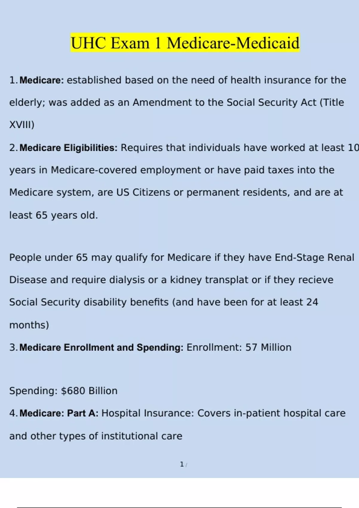 UHC Exam 1 Medicare-Medicaid | Questions with 100% Correct Answers | Verified | Updated 2024