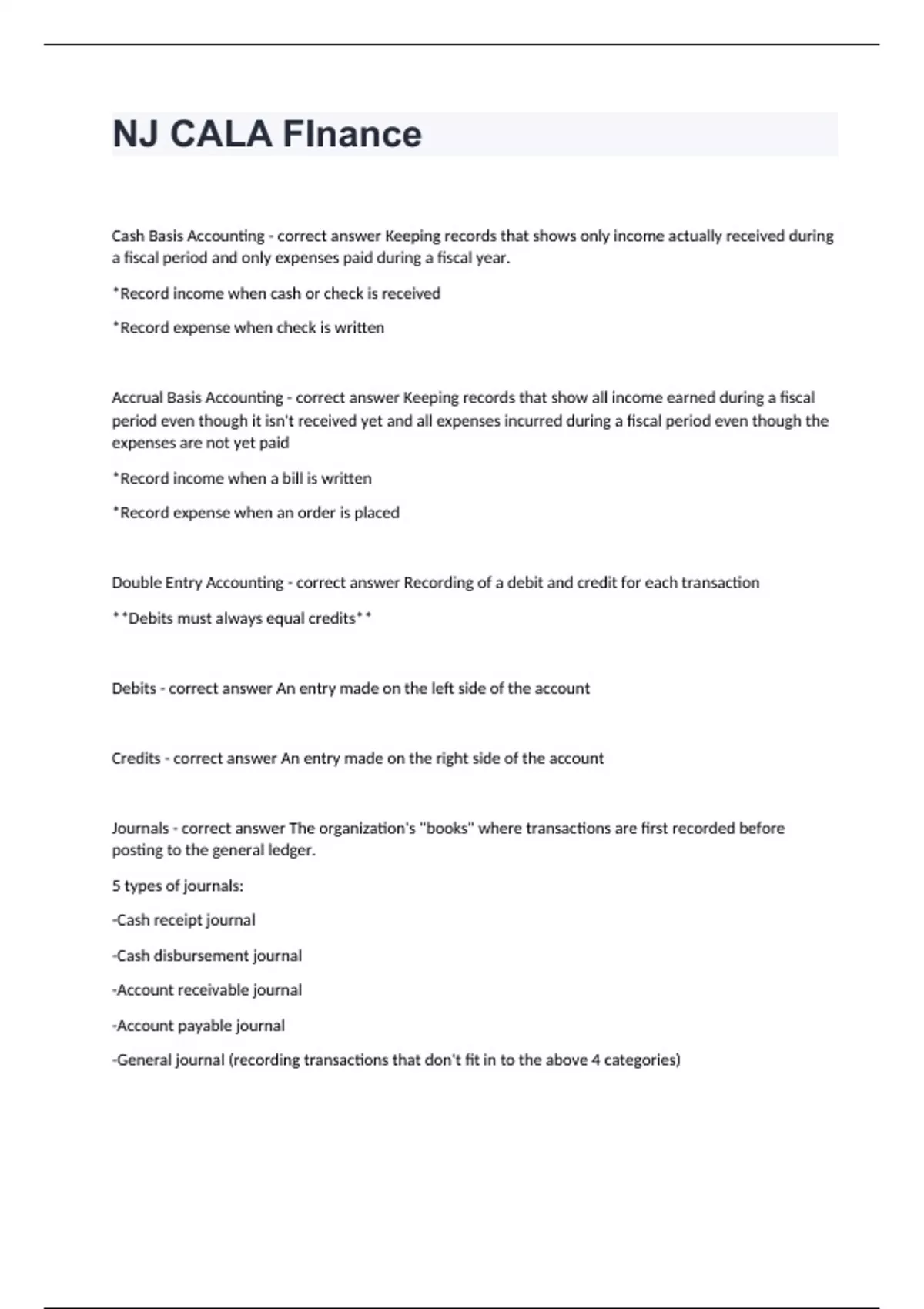 NJ CALA FInance Questions with complete solution 2023/2024 Cash Basis Accounting - correct answer Keeping records that shows only income actually received during a fiscal period and only expenses paid during a fiscal year. *Record income when cash or check is received *Record expense when check is written Accrual Basis Accounting - correct answer Keeping records that show all income earned during a fiscal period even though it isn't received yet and all expenses incurred during a fiscal period even though the expenses are not yet paid *Record income when a bill is written *Record expense when an order is placed Double Entry Accounting - correct answer Recording of a debit and credit for each transaction **Debits must always equal credits** Debits - correct answer An entry made on the left side of the account Credits - correct answer An entry made on the right side of the account