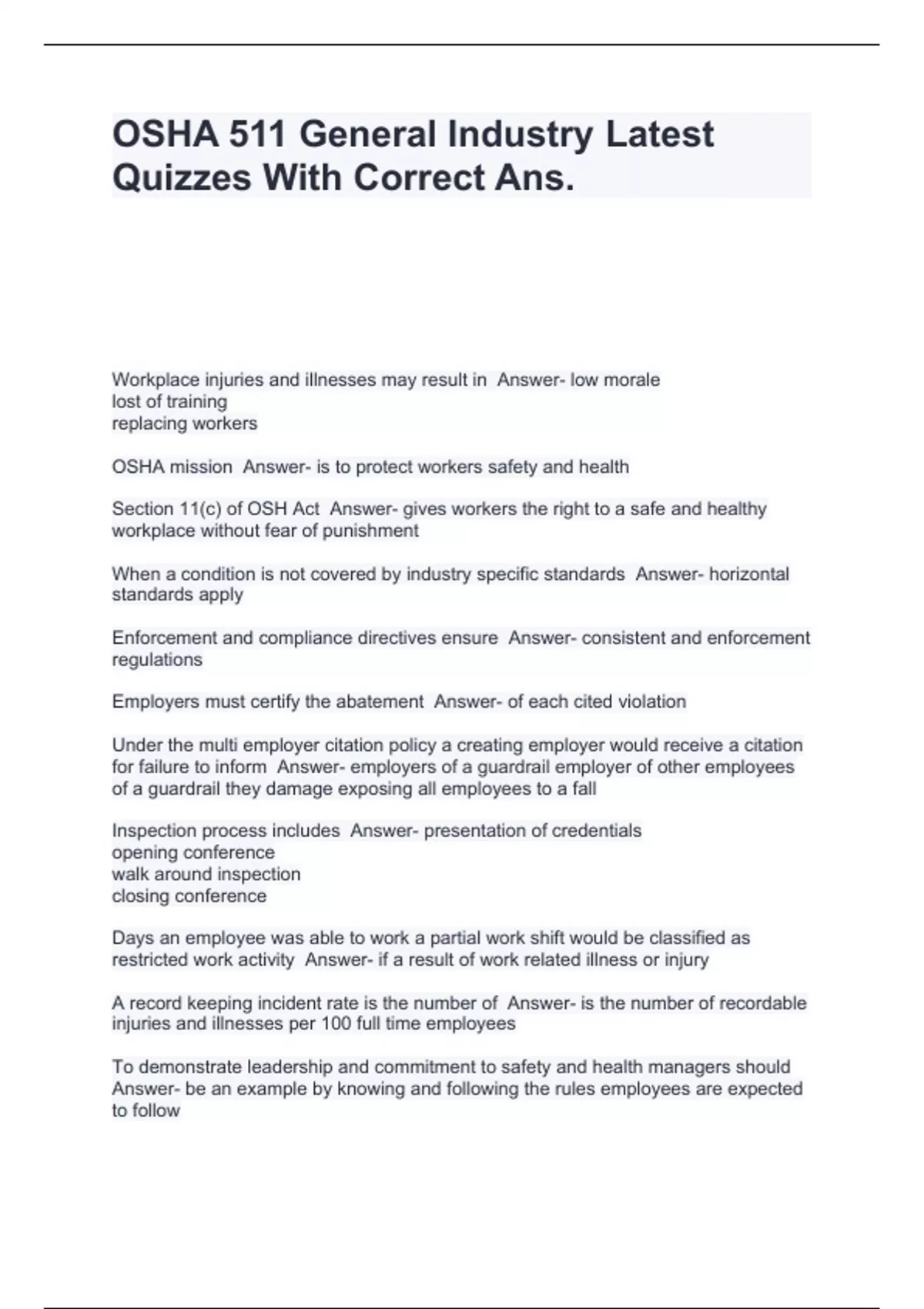 OSHA 511 General Industry Latest Quizzes With Correct Ans.