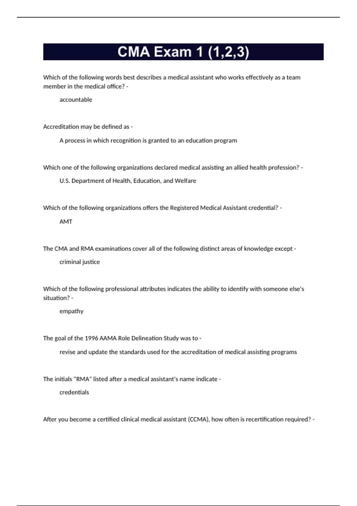 Exam of 13 pages for the course CERTIFIED CLINICAL MEDICAL ASSISSTANT at CERTIFIED CLINICAL MEDICAL ASSISSTANT (CMA Exam 1 (1,2,3).)