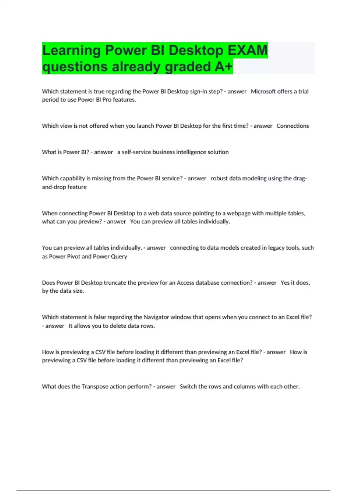 Which statement is true regarding the Power BI Desktop sign-in step? Microsoft offers a trial period to use Power BI Pro features. Which view is not offered when you launch Power BI Desktop for the first time? Connections What is Power BI? a self-service business intelligence solution Which capability is missing from the Power BI service? robust data modeling using the drag-and-drop feature When connecting Power BI Desktop to a web data source pointing to a webpage with multiple tables, what can you preview? You can preview all tables individually. You can preview all tables individually. connecting to data models created in legacy tools, such as Power Pivot and Power Query Does Power BI Desktop truncate the preview for an Access database connection? Yes it does, by the data size. Which statement is false regarding the Navigator window that opens when you connect to an Excel file? It allows you to delete data rows. How is previewing a CSV file before loading it different than previewing an Excel file? How is previewing a CSV file before loading it different than previewing an Excel file? What does the Transpose action perform? Switch the rows and columns with each other. Which statement is false regarding the Applied Steps in Power Query Editor? Adding a step immediately changes the underlying data source. When will the Replace Values operation generate an error? when replacing numeric values with letters Your company is tracking sales data in Excel. What would be your recommendation on how to arrange this data for a multiyear analysis? Keep all the data in one big sheet, with columns to denote the sale date and year. Which statement is false regarding a column index that you add using the default choices? It starts with index 1. When merging tables in Power BI Desktop, which join kind shows all rows from the second table, and matching from the first table? right outer Which language is behind the custom query formulas? M What step should you perform before adding data from more tables, if you need to eventually aggregate the data by which table it originally came from? Add a custom column to each table, set to the table name. What should you check before changing a text column to a decimal number type? Negative values use the minus symbol, not a hyphen. Which cardinality will you use to represent a bank customer in one table related to different bank accounts in a different table? one to many What does the index of a row represent when you add an index column? the position of that row in the row order What is a quick way to tell that data that consists of numbers is actually formatted as text? The values will be left-justified. When merging two tables using a left outer join, what shows when there is no match? Cells that do not match will show null. You need to add another column to your data that simply sets all values to the text "complete". Which custom column formula should you use? ="complete" Which statement is false regarding custom visuals? They have to be purchased. In a standard card visualization, a field added to the card is added at the _____. right Your report consists of a bar chart and a tree map visualizing the same data. What happens when you select one bar in the bar chart? The selection is highlighted in both visualizations. How can adding a card visualization to your map help? The card can show more details on data selected in the map. Preset styles _____. are based on the theme Which statement is not true regarding the Q&A visualization? By default, field names entered in the Q&A visualization must match the field names in the data model. What is not an option with Q&A Setup? Format Q&A visualization Which statement is true regarding slicers? A slicer can filter at both the page level and the report level. A slicer can filter at both the page level and the report level. data reporting Which defaults will a report have for its filters when it is imported into the Power BI service? The filters will default to the same values they were last saved with. The filters will default to the same values they were last saved with. Yes, quick insights are offered, even if you just publish a data set. What happens when you publish a PBIX file with a name that is already used? The system will ask whether you want to replace the data set.