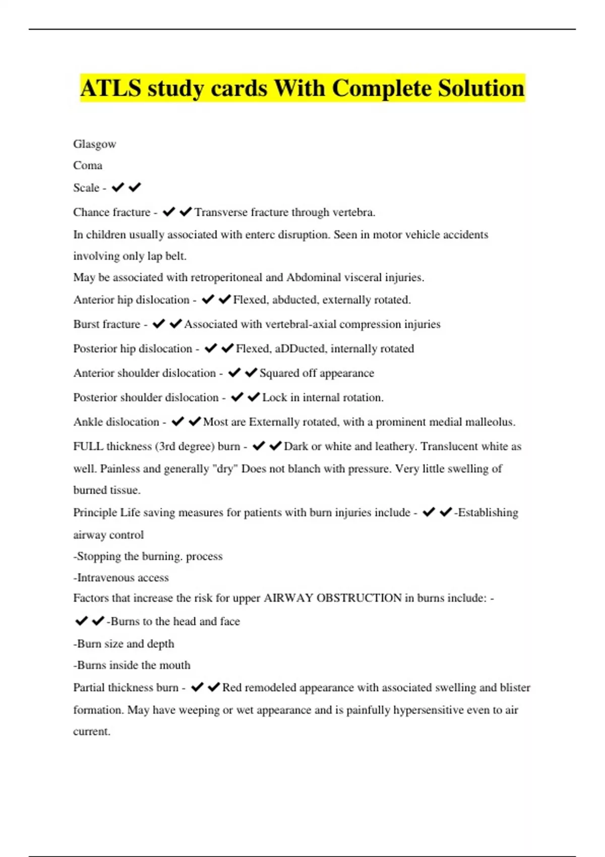ATLS study cards With Complete Solution Glasgow Coma Scale - ️️ Chance fracture - ️️Transverse fracture through vertebra. In children usually associated with enterc disruption. Seen in motor vehicle accidents involving only lap belt. May be associated with retroperitoneal and Abdominal visceral injuries. Anterior hip dislocation - ️️Flexed, abducted, externally rotated. Burst fracture - ️️Associated with vertebral-axial compression injuries Posterior hip dislocation - ️️Flexed, aDDucted, internally rotated Anterior shoulder dislocation - ️️Squared off appearance Posterior shoulder dislocation - ️️Lock in internal rotation. Ankle dislocation - ️️Most are Externally rotated, with a prominent medial malleolus. FULL thickness (3rd degree) burn - ️️Dark or white and leathery. Translucent white as well. Painless and generally "dry" Does not blanch with pressure. Very little swelling of burned tissue. Principle Life saving measures for patients with burn injuries include - ️️-Establishing airway control -Stopping the burning. process -Intravenous access Factors that increase the risk for upper AIRWAY OBSTRUCTION in burns include: - ️️-Burns to the head and face