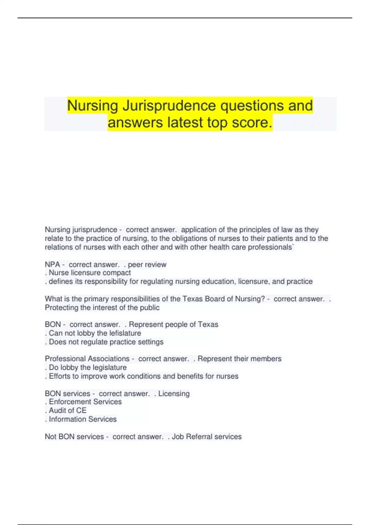 Nursing Jurisprudence questions and answers latest top score. Nursing jurisprudence - correct answer. application of the principles of law as they relate to the practice of nursing, to the obligations of nurses to their patients and to the relations of nurses with each other and with other health care professionals` NPA - correct answer. . peer review . Nurse licensure compact . defines its responsibility for regulating nursing education, licensure, and practice What is the primary responsibilities of the Texas Board of Nursing? - correct answer. . Protecting the interest of the public BON - correct answer. . Represent people of Texas . Can not lobby the lefislature . Does not regulate practice settings Professional Associations - correct answer. . Represent their members . Do lobby the legislature . Efforts to improve work conditions and benefits for nurses BON services - correct answer. . Licensing . Enforcement Services . Audit of CE . Information Services Not BON services - correct answer. . Job Referral services . Legal Referral . salary Question . Co worker disputes . Employment issues Temporary permit - correct answer. . GN permit expires in 75 days . When pass or fail NCLEX Renew ONLIne - correct answer. 60 days prior to expiration BON will send postacard Continuing Education - correct answer. . Must complete 20 hours in 2 years . First time renewal exempt . CE hours must be in area of practice . Keep records for 4 years Ethical Conduct - correct answer. . Honesty . Accountability . Trustworthiness . Reliability . Integrity Peer Review - correct answer. . employer must establish a peer review committee if they regularly employ, hire or contracts more than 10 nurses. The employer must establish policies and procedures governing the peer review committee process . committee will evaluate nursing services, qualifications of a nurse and the quality of care provided by a nurse and the merits of a complaint. . committee will determine whether the incident needs to be reported to the BON . Incident based (whistle blower) . Safe harbor Standards that apply to RN - correct answer. . Make nursing diagnosis . Develop nursing care plan . Evaluate pt resonse to nursing care . Perform comprehensive assessment . Delegate tasks to unlicensed personnel . Practice independently within the NPA and Board rules . Education to care for all patients Standards that apply to LVN - correct answer. . Participate in pllaning of nursing care . Assist in evaluating pt response to tx . Complete focused nursing assessment . Implement appropriate aspects of nursing care . Practice must be supervised . Educated to care for patients with stable and predictable conditions