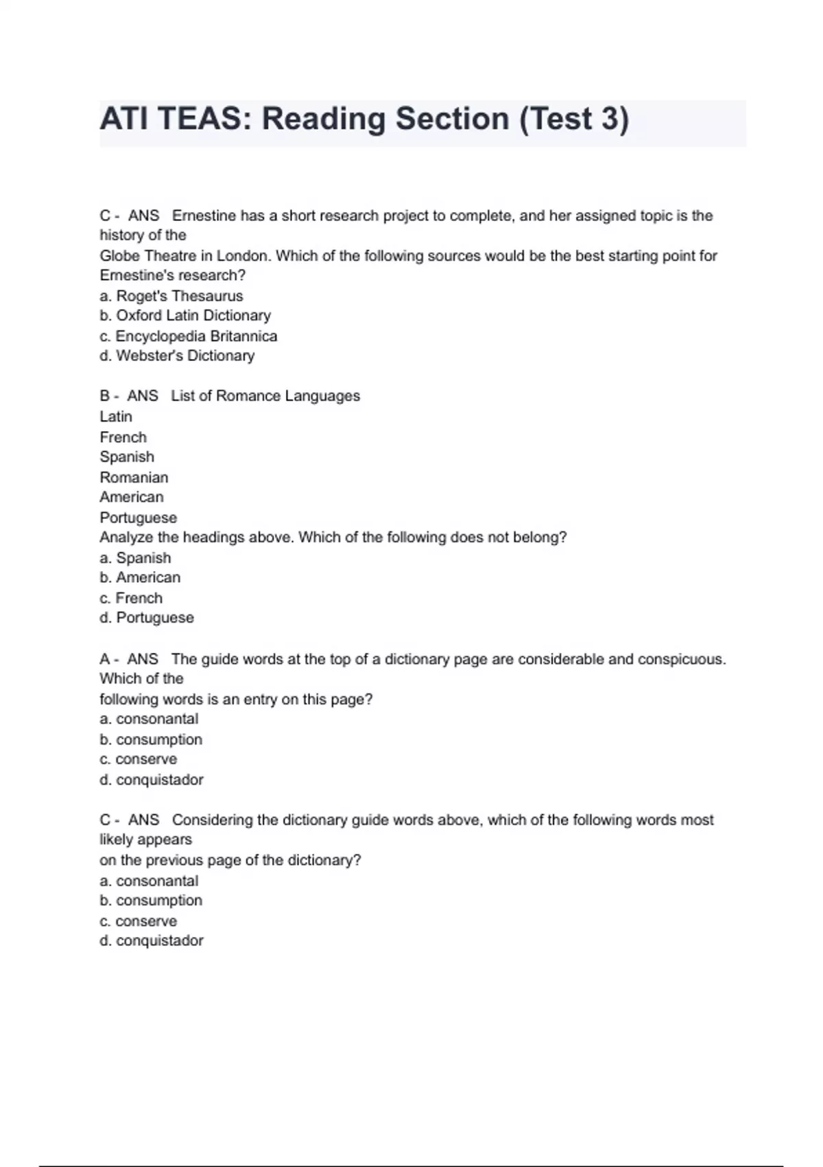 ATI TEAS: Reading Section (Test 3) Questions And Answers C - ANS Ernestine has a short research project to complete, and her assigned topic is the history of the Globe Theatre in London. Which of the following sources would be the best starting point for Ernestine's research? a. Roget's Thesaurus b. Oxford Latin Dictionary c. Encyclopedia Britannica d. Webster's Dictionary B - ANS List of Romance Languages Latin French Spanish Romanian American Portuguese Analyze the headings above. Which of the following does not belong? a. Spanish b. American c. French d. Portuguese A - ANS The guide words at the top of a dictionary page are considerable and conspicuous. Which of the following words is an entry on this page? a. consonantal b. consumption c. conserve d. conquistador C - ANS Considering the dictionary guide words above, which of the following words most likely appears on the previous page of the dictionary? a. consonantal b. consumption c. conserve d. conquistador