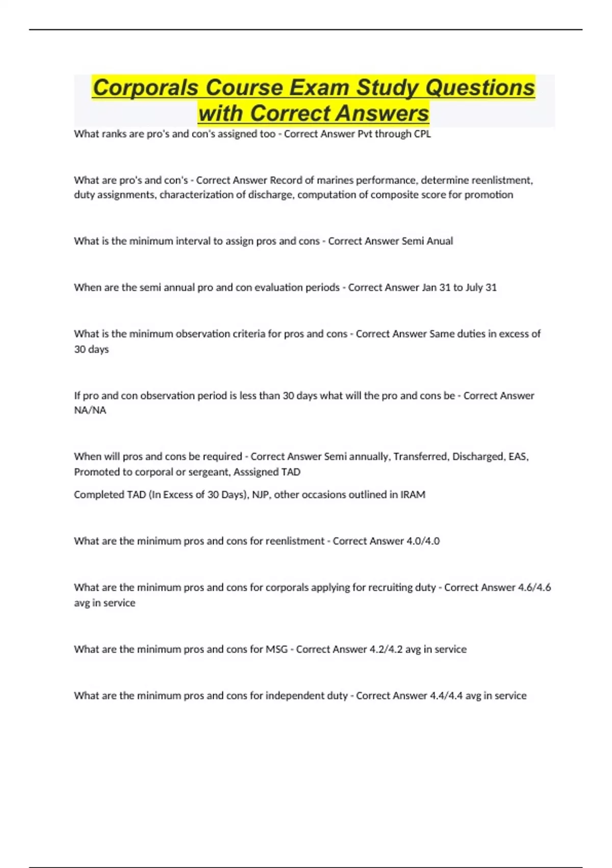 Corporals Course Exam Study Questions with Correct Answers What ranks are pro's and con's assigned too - Correct Answer Pvt through CPL What are pro's and con's - Correct Answer Record of marines performance, determine reenlistment, duty assignments, characterization of discharge, computation of composite score for promotion What is the minimum interval to assign pros and cons - Correct Answer Semi Anual When are the semi annual pro and con evaluation periods - Correct Answer Jan 31 to July 31 What is the minimum observation criteria for pros and cons - Correct Answer Same duties in excess of 30 days If pro and con observation period is less than 30 days what will the pro and cons be - Correct Answer NA/NA When will pros and cons be required - Correct Answer Semi annually, Transferred, Discharged, EAS, Promoted to corporal or sergeant, Asssigned TAD Completed TAD (In Excess of 30 Days), NJP, other occasions outlined in IRAM What are the minimum pros and cons for reenlistment - Correct Answer 4.0/4.0 What are the minimum pros and cons for corporals applying for recruiting duty - Correct Answer 4.6/4.6 avg in service What are the minimum pros and cons for MSG - Correct Answer 4.2/4.2 avg in service What are the minimum pros and cons for independent duty - Correct Answer 4.4/4.4 avg in service What are the minimum pros and cons for honorable