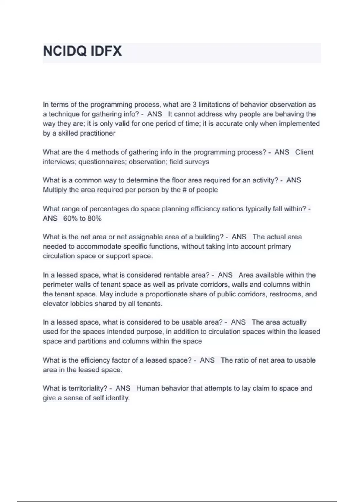 NCIDQ IDFX EXAM QUESTIONS AND ANSWERS In terms of the programming process, what are 3 limitations of behavior observation as a technique for gathering info? - ANS It cannot address why people are behaving the way they are; it is only valid for one period of time; it is accurate only when implemented by a skilled practitioner What are the 4 methods of gathering info in the programming process? - ANS Client interviews; questionnaires; observation; field surveys What is a common way to determine the floor area required for an activity? - ANS Multiply the area required per person by the # of people What range of percentages do space planning efficiency rations typically fall within? - ANS 60% to 80% What is the net area or net assignable area of a building? - ANS The actual area needed to accommodate specific functions, without taking into account primary circulation space or support space. In a leased space, what is considered rentable area? - ANS Area available within the perimeter walls of tenant space as well as private corridors, walls and columns within the tenant space. May include a proportionate share of public corridors, restrooms, and elevator lobbies shared by all tenants. In a leased space, what is considered to be usable area? - ANS The area actually used for the spaces intended purpose, in addition to circulation spaces within the leased space and partitions and columns within the space What is the efficiency factor of a leased space? - ANS The ratio of net area to usable area in the leased space. What is territoriality? - ANS Human behavior that attempts to lay claim to space and give a sense of self identity.