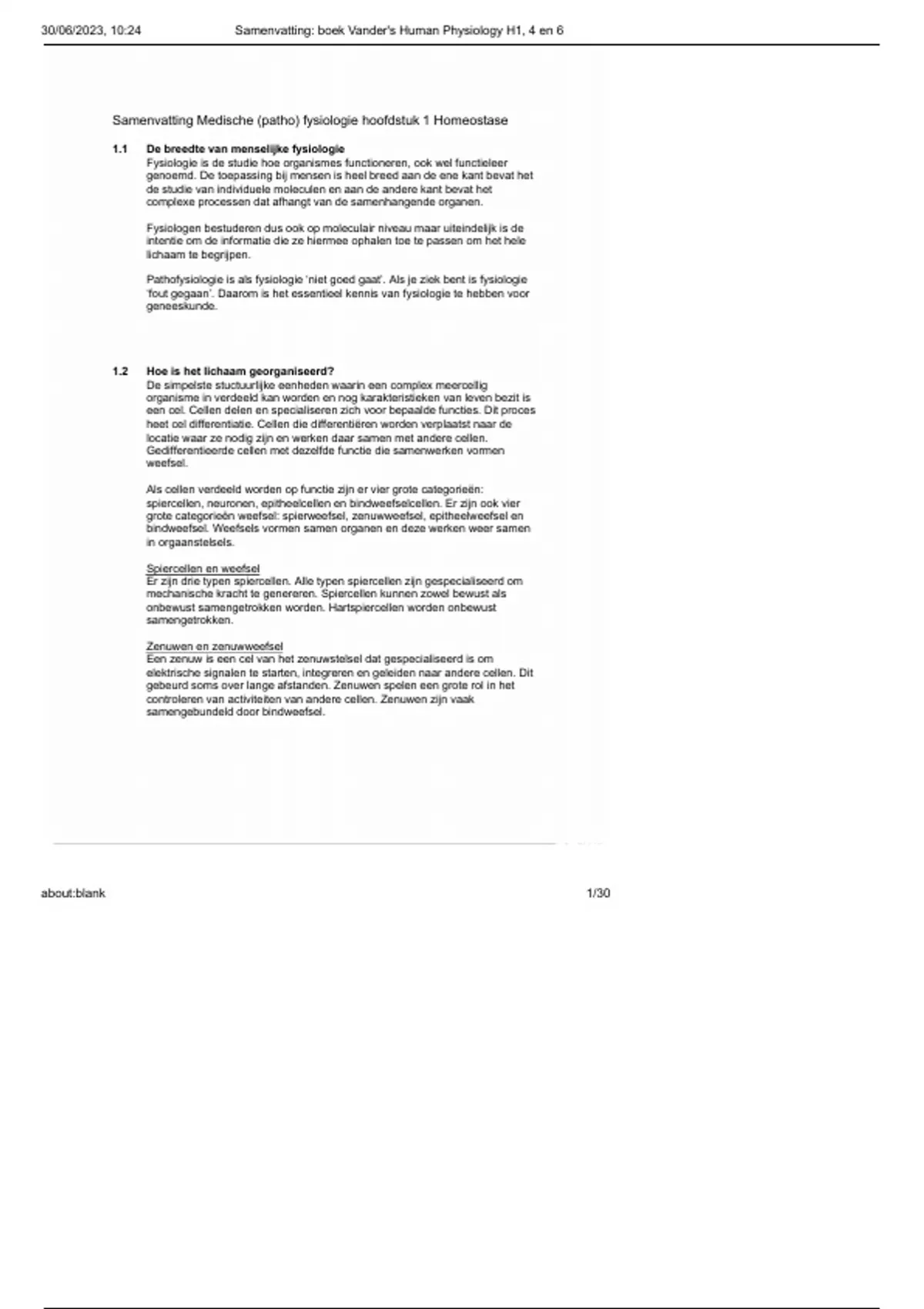 Samenvatting boek vander s human physiology h1 4 en 6 vrije universiteit 1.1 De breedte van menselijke fysiologie Fysiologie is de studie hoe organismes functioneren, ook wel functieleer genoemd. De toepassing bij mensen is heel breed aan de ene kant bevat het de studie van individuele moleculen en aan de andere kant bevat het complexe processen dat afhangt van de samenhangende organen. Fysiologen bestuderen dus ook op moleculair niveau maar uiteindelijk is de intentie om de informatie die ze hiermee ophalen toe te passen om het hele lichaam te begrijpen. Pathofysiologie is als fysiologie ‘niet goed gaat’. Als je ziek bent is fysiologie ‘fout gegaan’. Daarom is het essentieel kennis van fysiologie te hebben voor geneeskunde. 1.2 Hoe is het lichaam georganiseerd? De simpelste stuctuurlijke eenheden waarin een complex meercellig organisme in verdeeld kan worden en nog karakteristieken van leven bezit is een cel. Cellen delen en specialiseren zich voor bepaalde functies. Dit proces heet cel differentiatie. Cellen die differentiëren worden verplaatst naar de locatie waar ze nodig zijn en werken daar samen met andere cellen. Gedifferentieerde cellen met dezelfde functie die samenwerken vormen weefsel. Als cellen verdeeld worden op functie zijn er vier grote categorieën: spiercellen, neuronen, epitheelcellen en bindweefselcellen. Er zijn ook vier grote categorieën weefsel: spierweefsel, zenuwweefsel, epitheelweefsel en bindweefsel. Weefsels vormen samen organen en deze werken weer samen in orgaanstelsels. Spiercellen en weefsel Er zijn drie typen spiercellen. Alle typen spiercellen zijn gespecialiseerd om mechanische kracht te genereren. Spiercellen kunnen zowel bewust als onbewust samengetrokken worden. Hartspiercellen worden onbewust samengetrokken. Zenuwen en zenuwweefsel Een zenuw is een cel van het zenuwstelsel dat gespecialiseerd is om elektrische signalen te starten, integreren en g