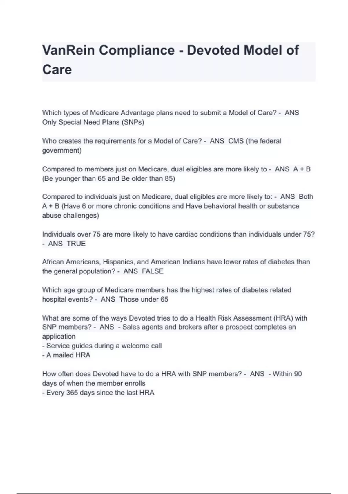 VanRein Compliance - Devoted Model of Care Questions And Answers Which types of Medicare Advantage plans need to submit a Model of Care? - ANS Only Special Need Plans (SNPs) Who creates the requirements for a Model of Care? - ANS CMS (the federal government) Compared to members just on Medicare, dual eligibles are more likely to - ANS A + B (Be younger than 65 and Be older than 85) Compared to individuals just on Medicare, dual eligibles are more likely to: - ANS Both A + B (Have 6 or more chronic conditions and Have behavioral health or substance abuse challenges) Individuals over 75 are more likely to have cardiac conditions than individuals under 75? - ANS TRUE African Americans, Hispanics, and American Indians have lower rates of diabetes than the general population? - ANS FALSE Which age group of Medicare members has the highest rates of diabetes related hospital events? - ANS Those under 65 What are some of the ways Devoted tries to do a Health Risk Assessment (HRA) with SNP members? - ANS - Sales agents and brokers after a prospect completes an application - Service guides during a welcome call - A mailed HRA How often does Devoted have to do a HRA with SNP members? - ANS - Within 90 days of when the member enrolls - Every 365 days since the last HRA