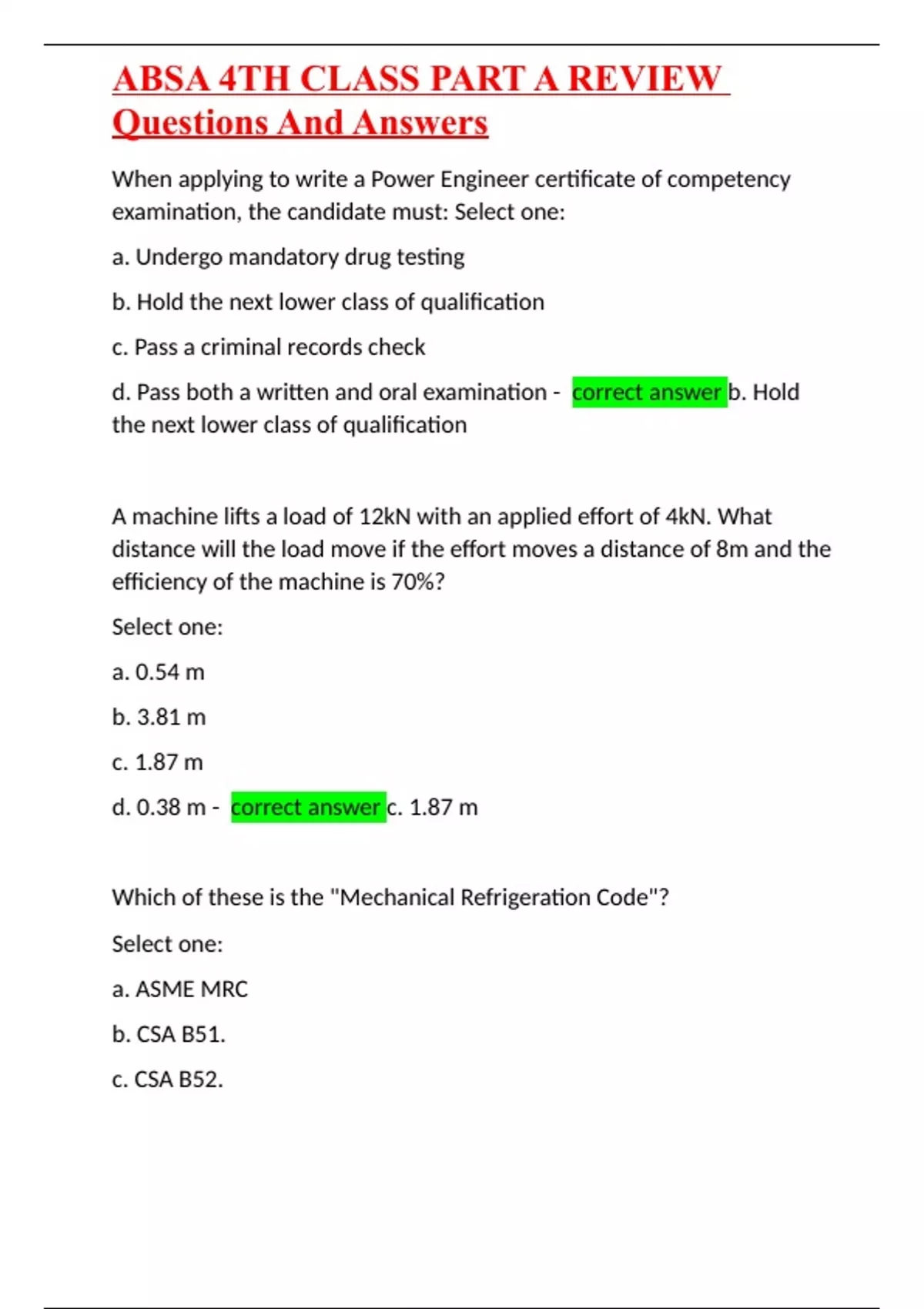 ABSA 4TH CLASS PART A REVIEW Questions And Answers