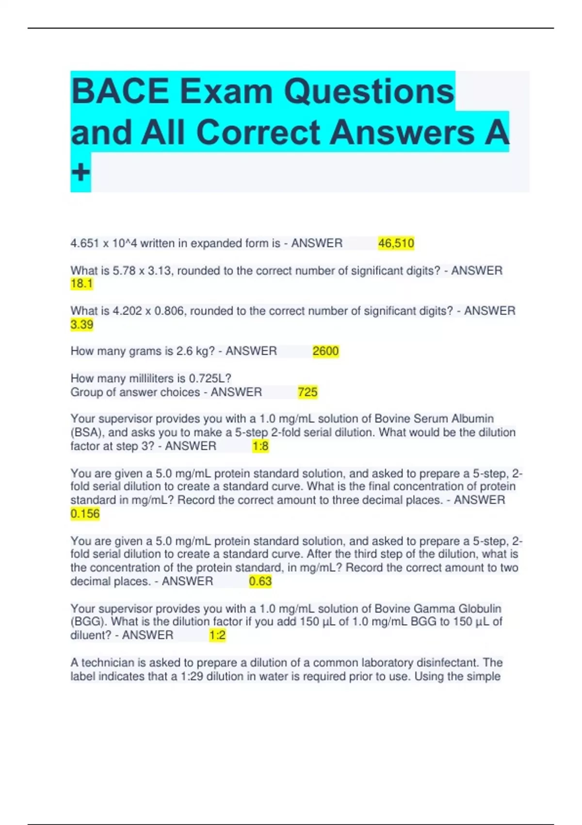 BACE Exam Questions and All Correct Answers A + 4.651 x 10^4 written in expanded form is - ANSWER 46,510 What is 5.78 x 3.13, rounded to the correct number of significant digits? - ANSWER 18.1 What is 4.202 x 0.806, rounded to the correct number of significant digits? - ANSWER 3.39 How many grams is 2.6 kg? - ANSWER 2600 How many milliliters is 0.725L? Group of answer choices - ANSWER 725 Your supervisor provides you with a 1.0 mg/mL solution of Bovine Serum Albumin (BSA), and asks you to make a 5-step 2-fold serial dilution. What would be the dilution factor at step 3? - ANSWER 1:8 You are given a 5.0 mg/mL protein standard solution, and asked to prepare a 5-step, 2- fold serial dilution to create a standard curve. What is the final concentration of protein standard in mg/mL? Record the correct amount to three decimal places. - ANSWER 0.156 You are given a 5.0 mg/mL protein standard solution, and asked to prepare a 5-step, 2- fold serial dilution to create a standard curve. After the third step of the dilution, what is the concentration of the protein standard, in mg/mL? Record the correct amount to two decimal places. - ANSWER 0.63 Your supervisor provides you with a 1.0 mg/mL solution of Bovine Gamma Globulin (BGG). What is the dilution factor if you add 150 µL of 1.0 mg/mL BGG to 150 µL of diluent? - ANSWER 1:2 A technician is asked to prepare a dilution of a common laboratory disinfectant. The label indicates that a 1:29 dilution in water is required prior to use. Using the simple dilution method, calculate the volume in mL of disinfectant required to make 1.0 L. Record the answer to one decimal place below - ANSWER 34.5 An SOP for preparing a bleach solution instructs to dilute the bleach 1:15 in water. Using the simple dilution method, calculate the volume in mL of bleach required to make 3.5 L. Record the correct amount to one decimal place. - ANSWER 233.3 mL You are given a stock protein solution with a concentration of 24 mg/mL. Determine the protein concentration of a solution made by mixing 5 μl of the stock with 45 μl of a buffer. Record the amount to one decimal place. - ANSWER 2.4 Calculate the volume in mL of 50X TE Buffer required to make 1.5 L of 1X TE Buffer. - ANSWER 30 mL Calculate the volume in mL of 25X TAE Buffer required to make 5.0 L of 1X TAE Buffer. Record the correct amount. - ANSWER 200 mL Calculate the volume in mL of a 10.5 mg/mL tetracycline stock solution required to make 525 mL LB with a final concentration of tetracycline at 2.75 mg/mL. Record the answer to one decimal place. - ANSWER 137.5 Which of the following is the correct method to make 1 L of 10% sodium chloride? - ANSWER Dissolve the appropriate amount of sodium chloride in a small volume of dH2O, then adjust the volume to 1 L Calculate the mass in g of agarose required to make 200 mL of a 1.2% agarose gel. Record the answer to one decimal place. - ANSWER 2.4 Calculate the mass in mg of kanamycin required to make 25 mL of a 12 mg/mL solution of kanamycin. - ANSWER 300 Calculate the mass in g of sucrose required to make 125 mL of a 15.5% (w/v) sucrose solution. Record the correct amount to one decimal place. - ANSWER 19.4 Calculate the mass in g of MgCl2 required to make 75 mL of a 20% (w/v) MgCl2 solution. Record the correct amount. - ANSWER 15 Calculate the volume in mL of a 10.0 M solution of HCl stock solution required to make 250 mL of 1.0 M HCl? Record the correct amount. - ANSWER 25 Calculate the volume in mL of a 1.5 M solution of NaOH stock solution required to make 275 mL of 50.0 mM NaOH? Record the answer to one decimal place. - ANSWER 9.2 Calculate the molarity of a solution containing 0.42 moles of NaCl in 2.5 L of water? Record the answer to two decimal places. - ANSWER .17 To dilute a bacterial culture, 10 uL of culture is mixed with fresh culture medium to a final volume of 0.5 mL. The culture was diluted by a factor of: - ANSWER 50 bleach - ANSWER Basic lemon juice - ANSWER Acidic Baking soda - ANSWER Basic Oven cleaner - ANSWER Basic vinegar - ANSWER Acidic NaCl bond type - ANSWER ionic bond H20 bond type - ANSWER Polar covalent CH4 bond type - ANSWER Nonpolar covalent What is used to calculate the amount of compound required to make a solution - ANSWER Molecular weight carbohydrates function - ANSWER Cellulose. Energy storage, receptors, structure of cell wall Lipids function - ANSWER Cholesterol. Membrane structure, energy storage Nucleic acids function - ANSWER RNA. information storage and transfer Proteins function - ANSWER Enzymes. structure, receptors, transport is the solvent the dissolved matter in a solution - ANSWER False Carbon dioxide as a by-product benefits the brewing and baking industry in a process called fermentation. When microorganisms (usually yeast) undergo fermentation, they obtain their energy by: - ANSWER Anaerobic respiration