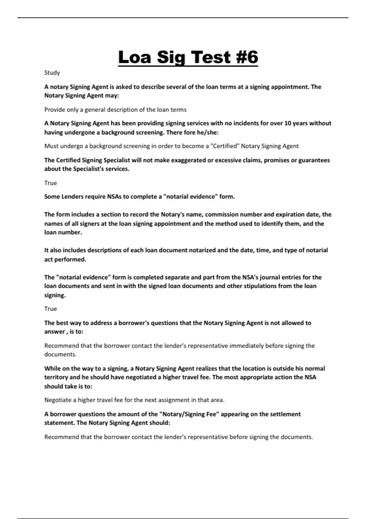 Loa Sig Test#6 A notary Signing Agent is asked to describe several of the loan terms at a signing appointment. The Notary Signing Agent may: Provide only a general description of the loan terms A Notary Signing Agent has been providing signing services with no incidents for over 10 years without having undergone a background screening. There fore he/she: Must undergo a background screening in order to become a "Certified" Notary Signing Agent The Certified Signing Specialist will not make exaggerated or excessive claims, promises or guarantees about the Specialist's services. True Some Lenders require NSAs to complete a "notarial evidence" form. The form includes a section to record the Notary's name, commission number and expiration date, the names of all signers at the loan signing appointment and the method used to identify them, and the loan number. It also includes descriptions of each loan document notarized and the date, time, and type of notarial act performed. The "notarial evidence" form is completed separate and part from the NSA's journal entries for the loan documents and sent in with the signed loan documents and other stipulations from the loan signing. True The best way to address a borrower's questions that the Notary Signing Agent is not allowed to answer , is to: Recommend that the borrower contact the lender's representative immediately before signing the documents. While on the way to a signing, a Notary Signing Agent realizes that the location is outside his normal territory and he should have negotiated a higher travel fee. The most appropriate action the NSA should take is to: Negotiate a higher travel fee for the next assignment in that area. A borrower questions the amount of the "Notary/Signing Fee" appearing on the settlement statement. The Notary Signing Agent should: Recommend that the borrower contact the lender's representative before signing the documents