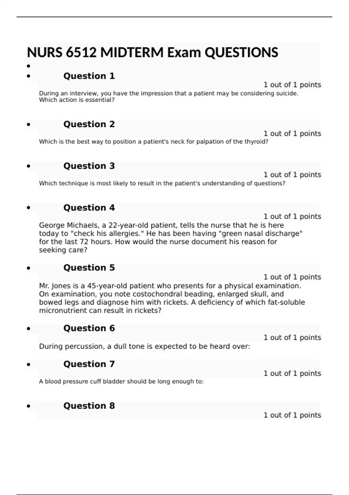 NURS 6512 MIDTERM Exam QUESTIONS Question 1 1 out of 1 points During an interview, you have the impression that a patient may be considering suicide. Which action is essential? Question 2 1 out of 1 points Which is the best way to position a patient's neck for palpation of the thyroid? Question 3 1 out of 1 points Which technique is most likely to result in the patient's understanding of questions? Question 4 1 out of 1 points George Michaels, a 22-year-old patient, tells the nurse that he is here today to "check his allergies." He has been having "green nasal discharge" for the last 72 hours. How would the nurse document his reason for seeking care? Question 5 1 out of 1 points Mr. Jones is a 45-year-old patient who presents for a physical examination. On examination, you note costochondral beading, enlarged skull, and bowed legs and diagnose him with rickets. A deficiency of which fat-soluble micronutrient can result in rickets? Question 6 1 out of 1 points During percussion, a dull tone is expected to be heard over: Question 7 1 out of 1 points A blood pressure cuff bladder should be long enough to: