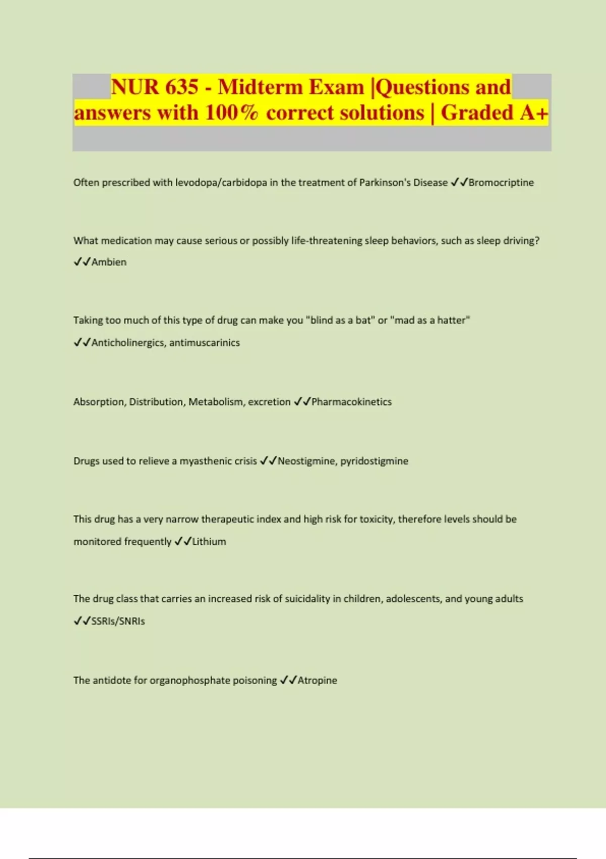 Often prescribed with levodopa/carbidopa in the treatment of Parkinson's Disease Bromocriptine What medication may cause serious or possibly life-threatening sleep behaviors, such as sleep driving? Ambien Taking too much of this type of drug can make you "blind as a bat" or "mad as a hatter" Anticholinergics, antimuscarinics Absorption, Distribution, Metabolism, excretion Pharmacokinetics Drugs used to relieve a myasthenic crisis Neostigmine, pyridostigmine This drug has a very narrow therapeutic index and high risk for toxicity, therefore levels should be monitored frequently Lithium The drug class that carries an increased risk of suicidality in children, adolescents, and young adults SSRIs/SNRIs The antidote for organophosphate poisoning Atropine
