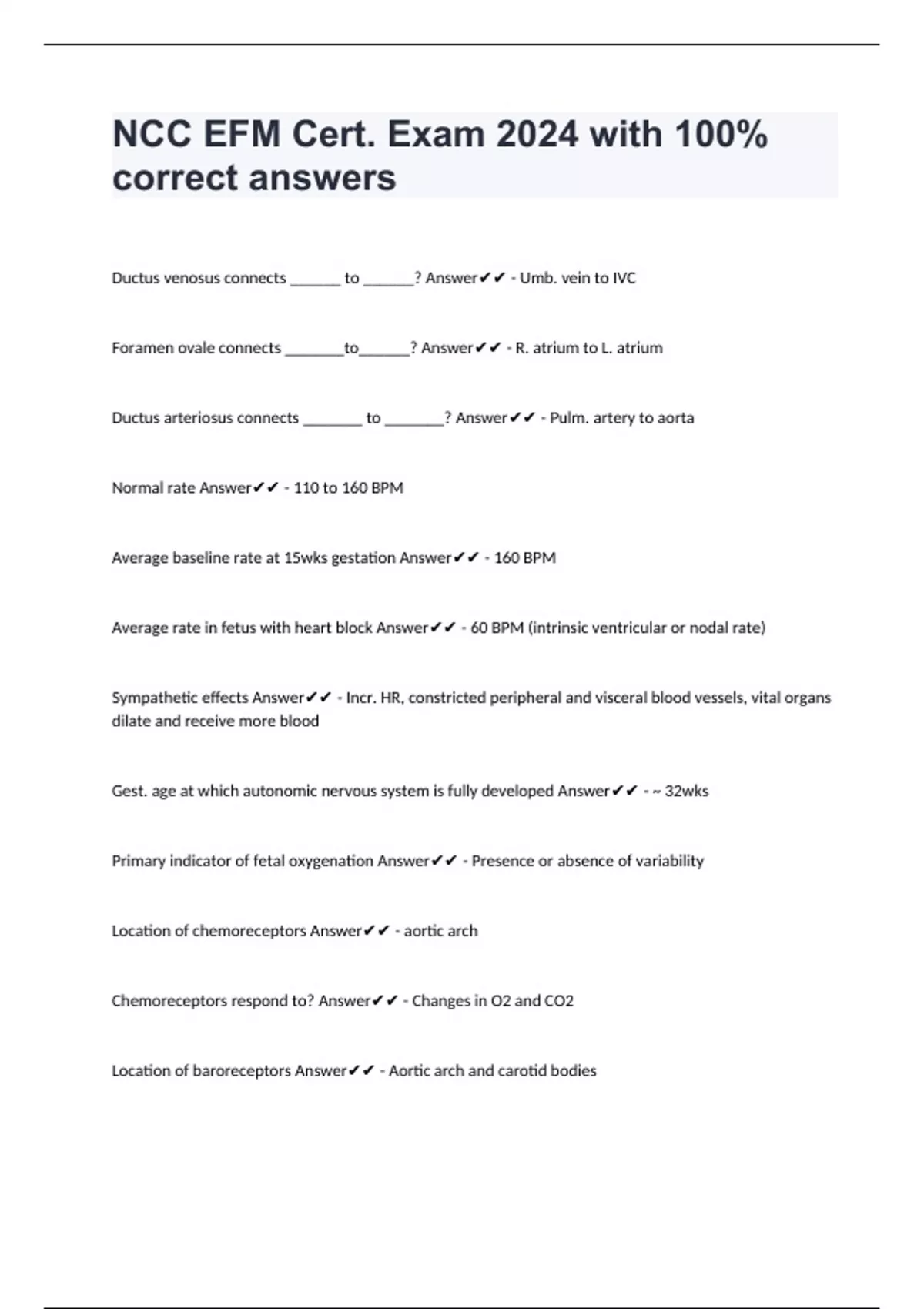 Ductus venosus connects ______ to ______? Answer - Umb. vein to IVC Foramen ovale connects _______to______? Answer - R. atrium to L. atrium Ductus arteriosus connects _______ to _______? Answer - Pulm. artery to aorta Normal rate Answer - 110 to 160 BPM Average baseline rate at 15wks gestation Answer - 160 BPM Average rate in fetus with heart block Answer - 60 BPM (intrinsic ventricular or nodal rate) Sympathetic effects Answer - Incr. HR, constricted peripheral and visceral blood vessels, vital organs dilate and receive more blood Gest. age at which autonomic nervous system is fully developed Answer - ~ 32wks Primary indicator of fetal oxygenation Answer - Presence or absence of variability Location of chemoreceptors Answer - aortic arch