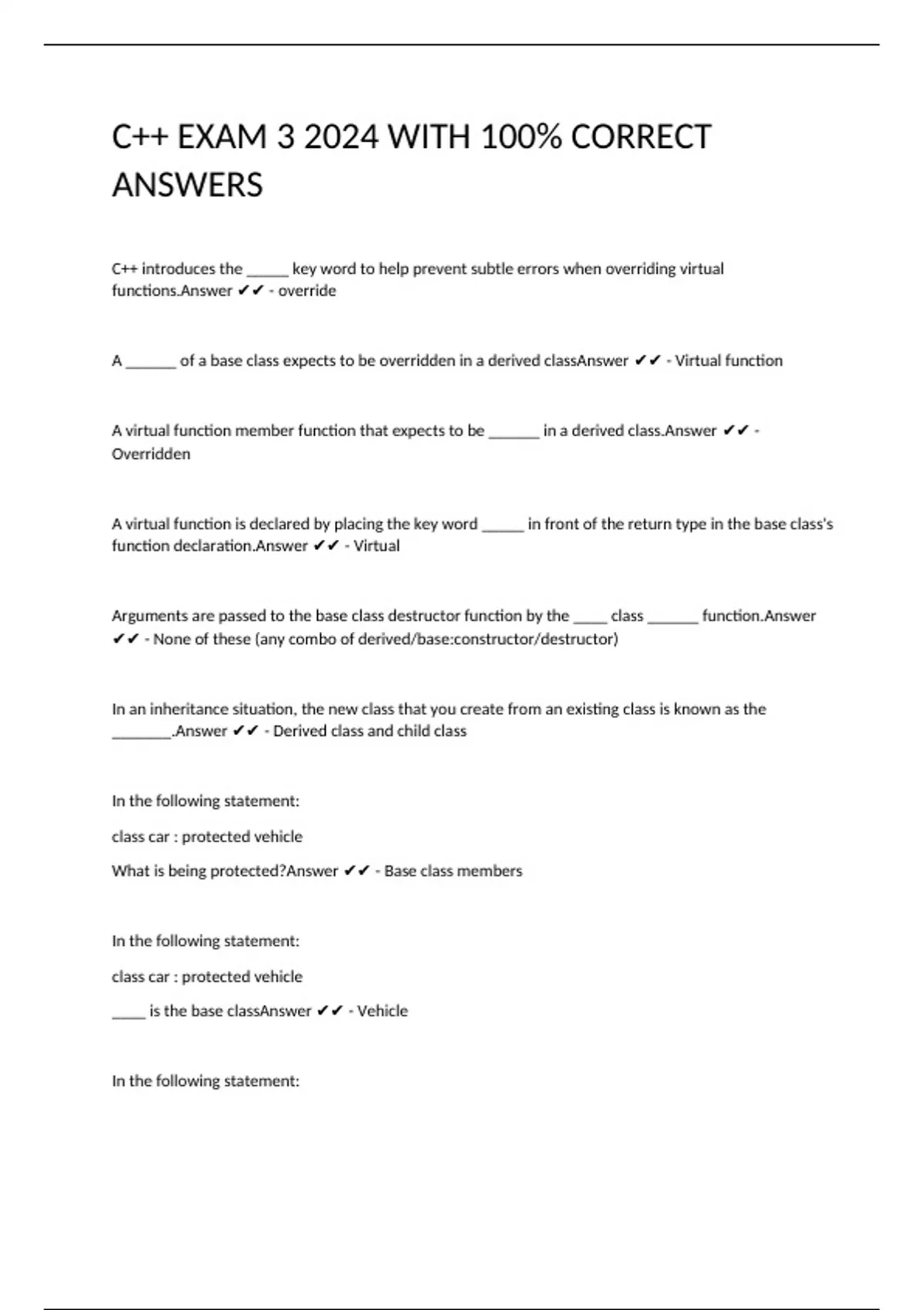 C++ introduces the _____ key word to help prevent subtle errors when overriding virtual functions.Answer - override A ______ of a base class expects to be overridden in a derived classAnswer - Virtual function A virtual function member function that expects to be ______ in a derived class.Answer - Overridden A virtual function is declared by placing the key word _____ in front of the return type in the base class's function declaration.Answer - Virtual Arguments are passed to the base class destructor function by the ____ class ______ function.Answer - None of these (any combo of derived/base:constructor/destructor) In an inheritance situation, the new class that you create from an existing class is known as the _______.Answer - Derived class and child class In the following statement: class car : pr