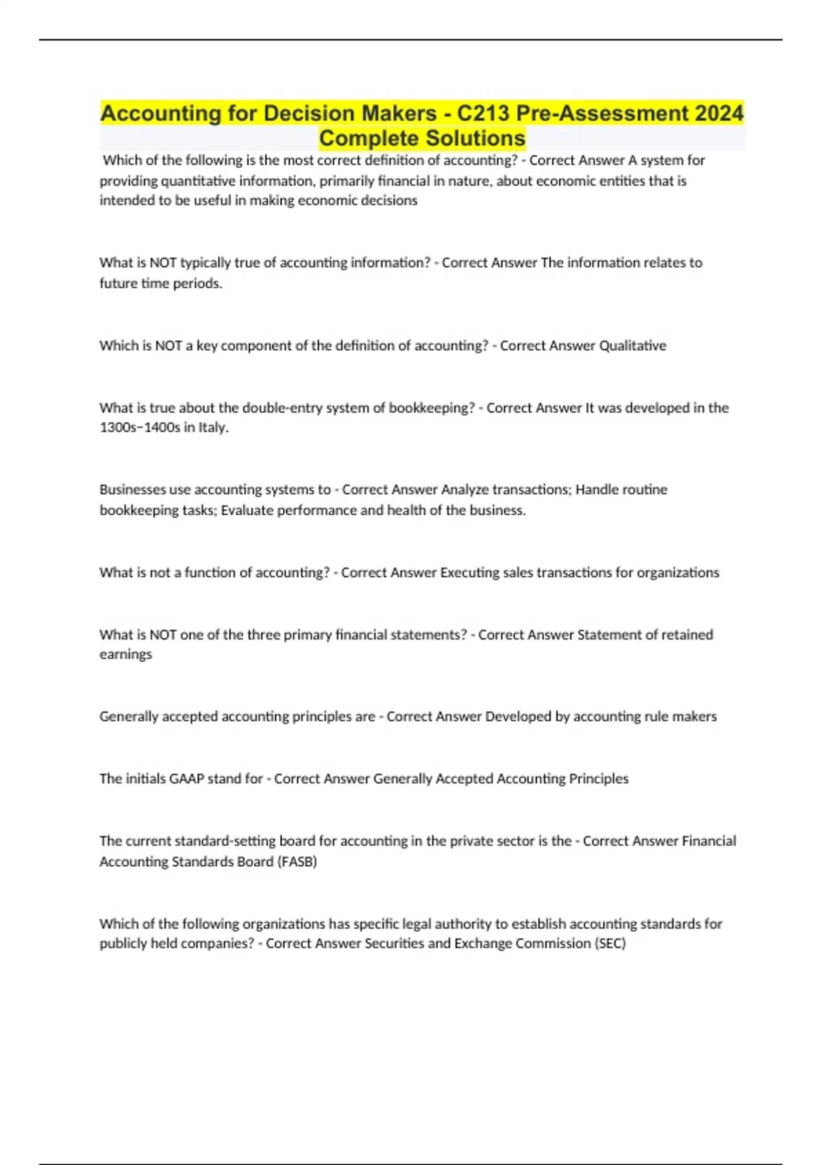 Accounting for Decision Makers - C213 Pre-Assessment 2024 Complete Solutions Which of the following is the most correct definition of accounting? - Correct Answer A system for providing quantitative information, primarily financial in nature, about economic entities that is intended to be useful in making economic decisions What is NOT typically true of accounting information? - Correct Answer The information relates to future time periods. Which is NOT a key component of the definition of accounting? - Correct Answer Qualitative What is true about the double-entry system of bookkeeping? - Correct Answer It was developed in the 1300s−1400s in Italy. Businesses use accounting systems to - Correct Answer Analyze transactions; Handle routine bookkeeping tasks; Evaluate performance and health of the business. What is not a function of accounting? - Correct Answer Executing sales transactions for organizations What is NOT one of the three primary financial statements? - Correct Answer Statement of retained earnings Generally accepted accounting principles are - Correct Answer Developed by accounting rule makers The initials GAAP stand for - Correct Answer Generally Accepted Accounting Principles The current standard-setting board for accounting in the private sector is the - Correct Answer Financial Accounting Standards Board (FASB) Which of the following organizations has specific legal authority to establish accounting standards for publicly held companies? - Correct Answer Securities and Exchange Commission (SEC) Which is NOT a serv