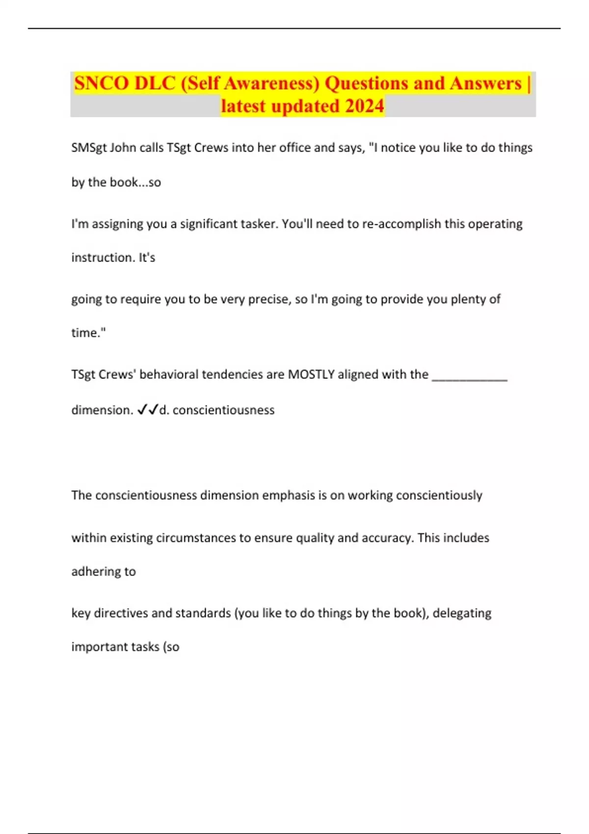 SMSgt John calls TSgt Crews into her office and says, "I notice you like to do things by the book...so I'm assigning you a significant tasker. You'll need to re-accomplish this operating instruction. It's going to require you to be very precise, so I'm going to provide you plenty of time." TSgt Crews' behavioral tendencies are MOSTLY aligned with the ___________ dimension. d. conscientiousness The conscientiousness dimension emphasis is on working conscientiously within existing circumstances to ensure quality and accuracy. This includes adhering to key directives and standards (you like to do things by the book), delegating important tasks (so