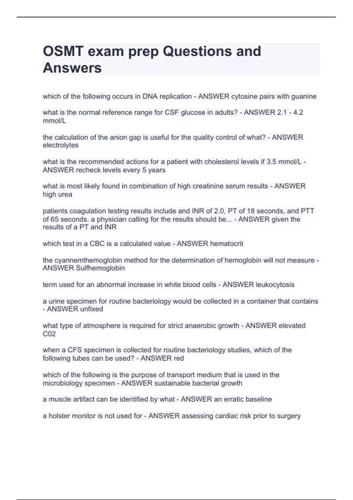 OSMT exam prep Questions and Answwhich of the following occurs in DNA replication - ANSWER cytosine pairs with guanine what is the normal reference range for CSF glucose in adults? - ANSWER 2.1 - 4.2 mmol/L the calculation of the anion gap is useful for the quality control of what? - ANSWER electrolytes what is the recommended actions for a patient with cholesterol levels if 3.5 mmol/L - ANSWER recheck levels every 5 years what is most likely found in combination of high creatinine serum results - ANSWER high urea patients coagulation testing results include and INR of 2.0, PT of 18 seconds, and PTT of 65 seconds. a physician calling for the results should be... - ANSWER given the results of a PT and INR which test in a CBC is a calculated value - ANSWER hematocrit ers