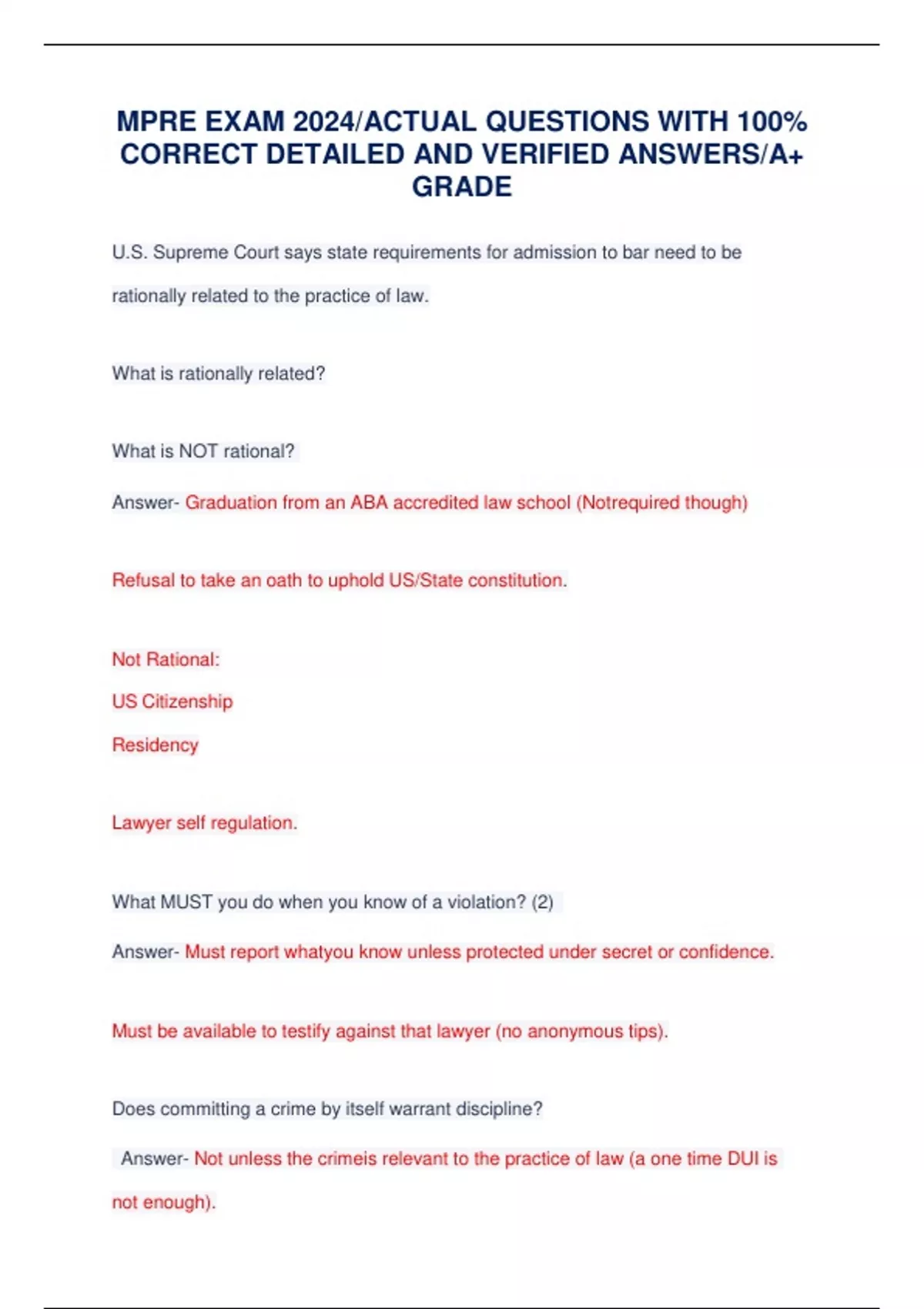 MPRE EXAM 2024/ACTUAL QUESTIONS WITH 100% CORRECT DETAILED AND VERIFIED ANSWERS/A+ GRADE U.S. Supreme Court says state requirements for admission to bar need to be rationally related to the practice of law. What is rationally related? What is NOT rational? Answer- Graduation from an ABA accredited law school (Not required though) Refusal to take an oath to uphold US/State constitution. Not Rational: US Citizenship Residency Lawyer self regulation. What MUST you do when you know of a violation? (2) Answer- Must report what you know unless protected under secret or confidence. Must be available to testify against that lawyer (no anonymous tips). Does committing a crime by itself warrant discipline? Answer- Not unless the crime is relevant to the pract