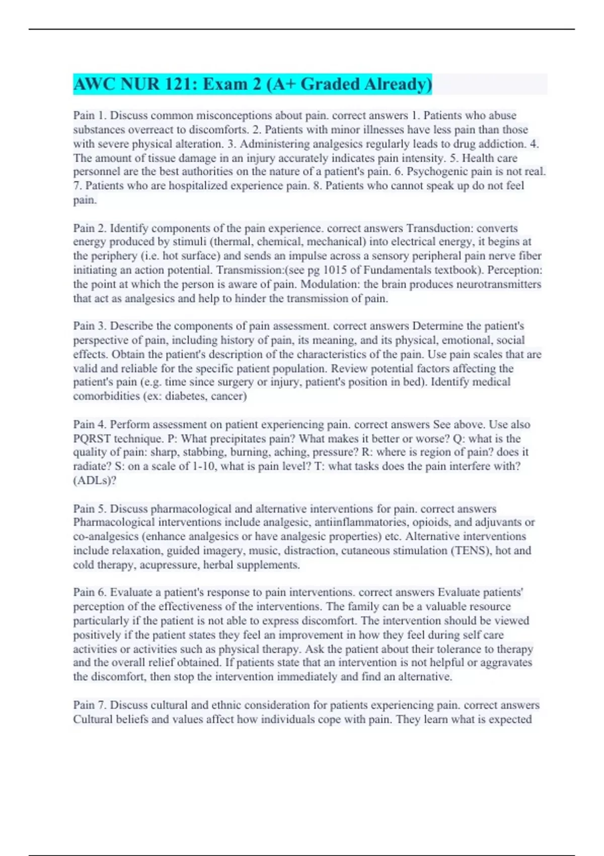 Pain 1. Discuss common misconceptions about pain. correct answers 1. Patients who abuse substances overreact to discomforts. 2. Patients with minor illnesses have less pain than those with severe physical alteration. 3. Administering analgesics regularly leads to drug addiction. 4. The amount of tissue damage in an injury accurately indicates pain intensity. 5. Health care personnel are the best authorities on the nature of a patient's pain. 6. Psychogenic pain is not real. 7. Patients who are hospitalized experience pain. 8. Patients who cannot speak up do not feel pain. Pain 2. Identify components of the pain experience. correct answers Transduction: converts energy produced by stimuli (thermal, chemical, mechanical) into electrical energy, it begins at the periphery (i.e. hot surface) and sends an impulse across a sensory peripheral pain nerve fiber initiating an action potential. Transmission:(see pg 1015 of Fundamentals textbook). Perception: the point at which the person is aware of pain. Modulation: the brain produces neurotransmitters that act as analgesics and help to hinder the transmission of pain. Pain 3. Describe the components of pain assessment. correct answers Determine the patient's perspective of pain, including history of pain, its meaning, and its physical, emotional, social effects. Obtain the patient's description of the characteristics of the pain. Use pain scales that are valid and reliable for the specific patient population. Review potential factors affecting the patient's pain (e.g. time since surgery or injury, patient's position in bed). Identify medical comorbidities (ex: diabetes, cancer) Pain 4. Perform assessment on patient experiencing pain. correct answers See above. Use also PQRST technique. P: What precipitates pain? What makes it better or worse? Q: what is the quality of pain: sharp, stabbing, burning, aching, pressure? R: where is region of pain? does it radiate? S: on a scale of 1-10, what is pain level? T: what tasks does the pain interfere with? (ADLs)? Pain 5. Discuss pharmacological and alternative interventions for pain. correct answers Pharmacological interventions include analgesic, antiinflammatories, opioids, and adjuvants or co-analgesics (enhance analgesics or have analgesic properties) etc. Alternative interventions include relaxation, guided imagery, music, distraction, cutaneous stimulation (TENS), hot and cold therapy, acupressure, herbal supplements. Pain 6. Evaluate a patient's response to pain interventions. correct answers Evaluate patients' perception of the effectiveness of the interventions. The family can be a valuable resource particularly if the patient is not able to express discomfort. The intervention should be viewed positively if the patient states they feel an improvement in how they feel during self care activities or activities such as physical therapy. Ask the patient about their tolerance to therapy and the overall relief obtained. If patients state that an intervention is not helpful or aggravates the discomfort, then stop the intervention immediately and find an alternative. Pain 7. Discuss cultural and ethnic consideration for patients experiencing pain. correct answers Cultural beliefs and values affect how individuals cope with pain. They learn what is expected