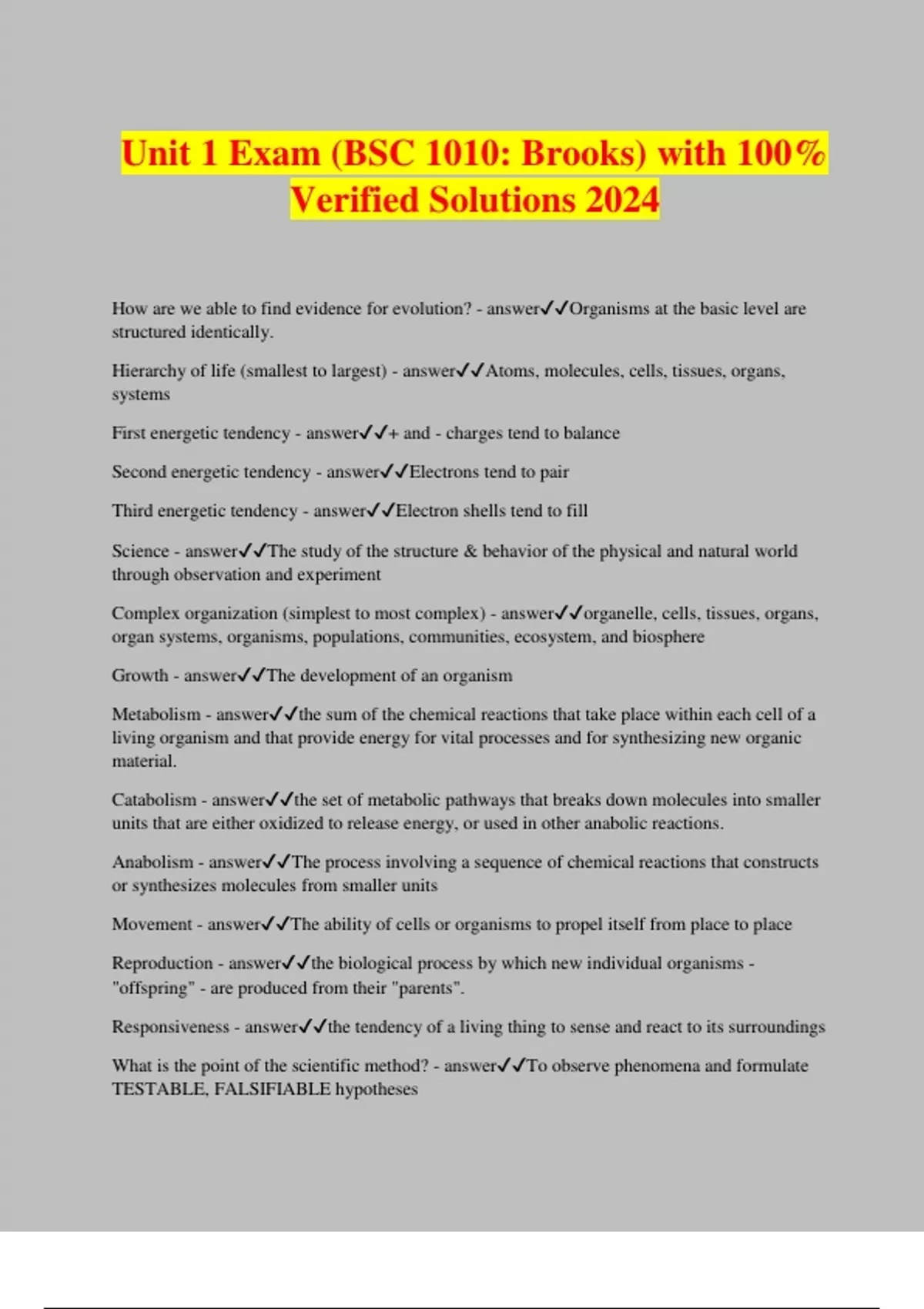 Unit 1 Exam (BSC 1010: Brooks) with 100% Verified Solutions 2024 How are we able to find evidence for evolution? - answerOrganisms at the basic level are structured identically. Hierarchy of life (smallest to largest) - answerAtoms, molecules, cells, tissues, organs, systems First energetic tendency - answer+ and - charges tend to balance Second energetic tendency - answerElectrons tend to pair Third energetic tendency - answerElectron shells tend to fill Science - answerThe study of the structure & behavior of the physical and natural world through observation and experiment Complex organization (simplest to most complex) - answerorganelle, cells, tissues, organs, organ systems, organisms, populations, communities, ecosystem, and biosphere