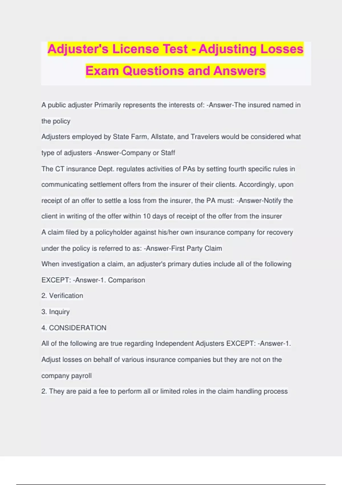 Adjuster's License Test - Adjusting Losses Exam Questions and Answers